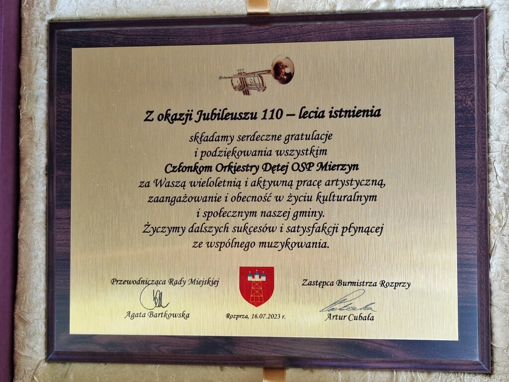 Uroczystą mszą świętą w kościele w Mierzynie rozpoczęły się obchody 110-lecia istnienia Orkiestry Dętej OSP Mierzyn. Następnie korowód przemaszerował na plac za remizę OSP, gdzie odbyły się oficjalne uroczystości.