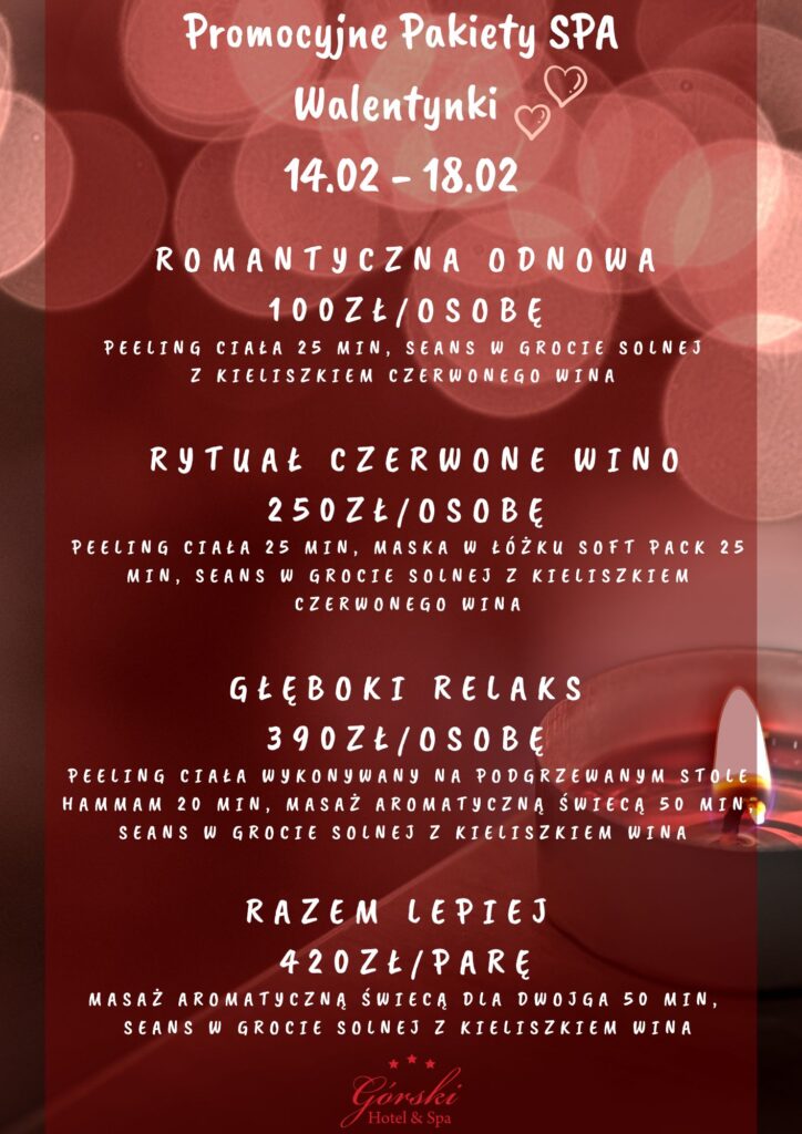 Zakochani mogą również skorzystać z masaży oraz zabiegów na twarz i ciało, przygotowanych w promocyjnej cenie przez Spa Górski oraz oferty noclegowej.
