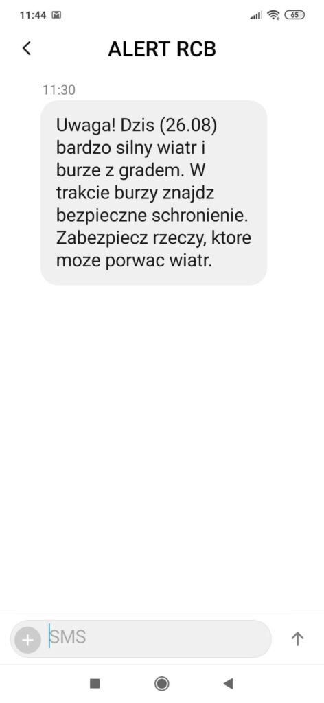 Rządowe Centrum Bezpieczeństwa informuje: Dziś (26.08) bardzo silny wiatr i burze z gradem. W trakcie burzy znajdź bezpieczne schronienie. Zabezpiecz rzeczy, które może porwać wiatr.