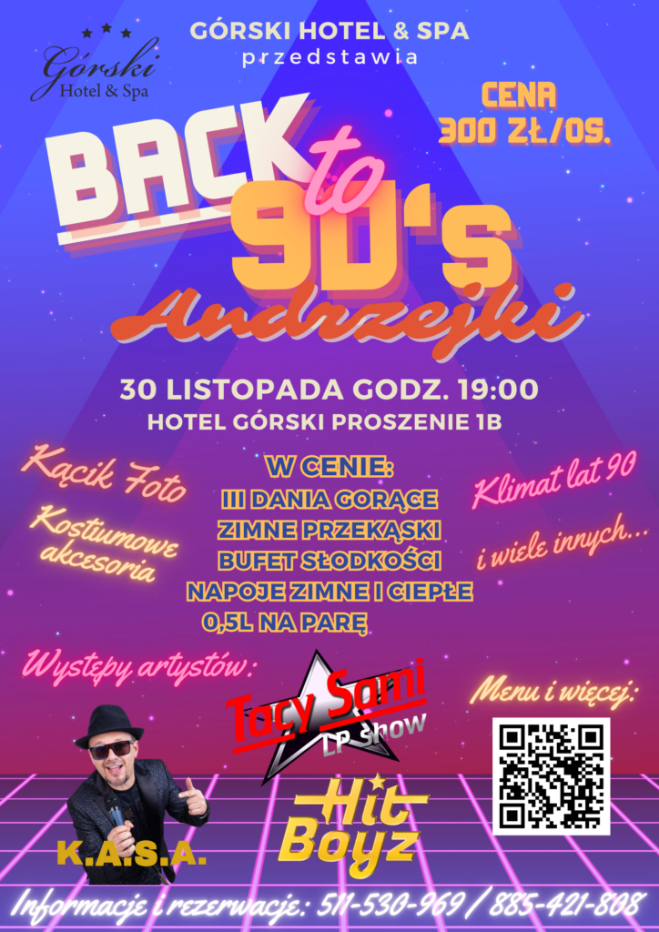 Największa Andrzejkowa Domówka w stylu lat 90 czyli Andrzejki 2024 w Hotelu Górski & Spa w Proszeniu. Wyobraźcie sobie, że przenosicie się w czasie do epoki neonowych kolorów, walkmanów, pierwszych karaoke i niekończących się kolejek do automatów z gumą balonową. Gdzie każdy wieczór zaczynał się od „Coco Jambo”, a kończył nieśmiertelnym „Jolką, Jolką”. Że wchodzicie do gigantycznej góralskiej chaty, gdzie tradycja i magia drewnianych bali spotykają szaleństwo lat 90, tworząc coś, co trudno opisać słowami – to trzeba po prostu przeżyć.