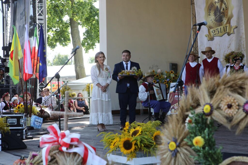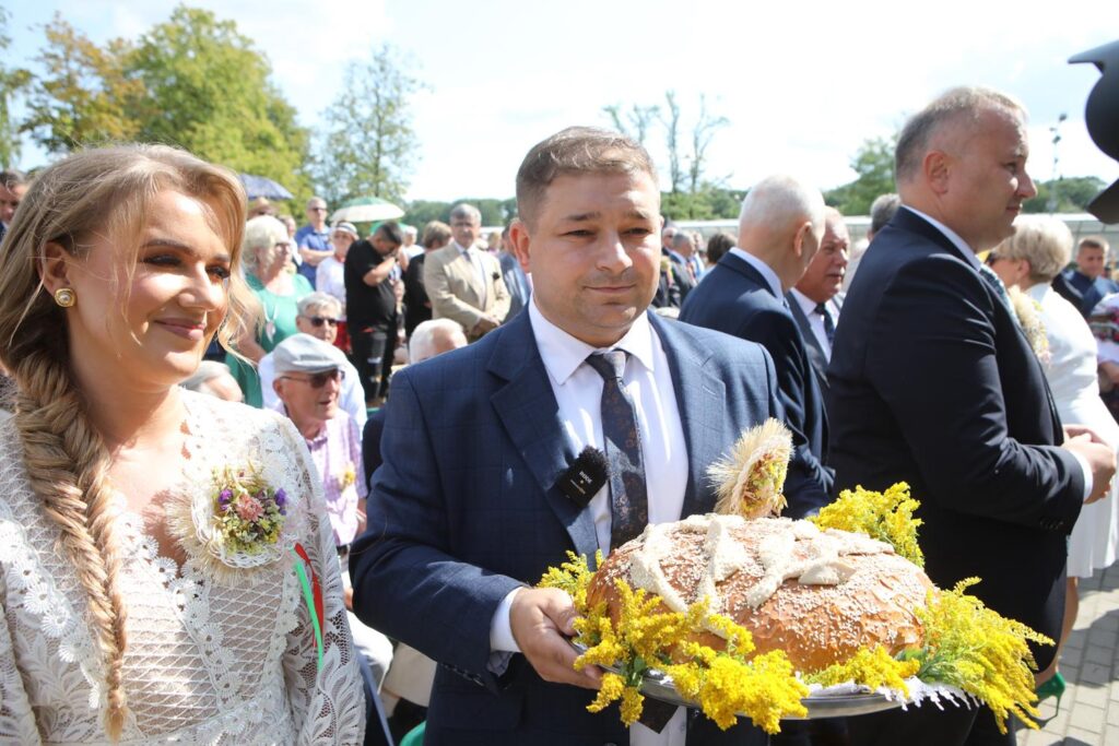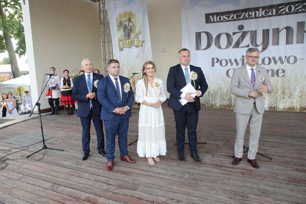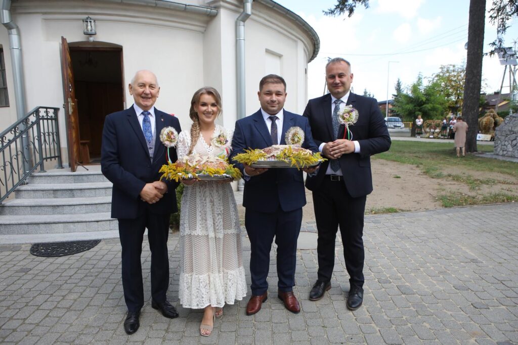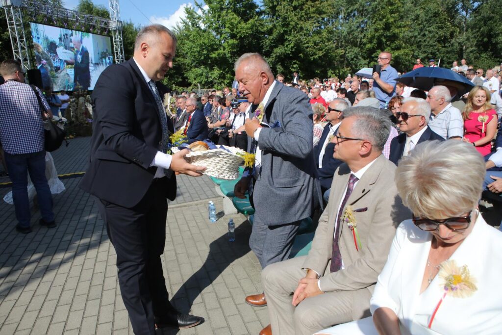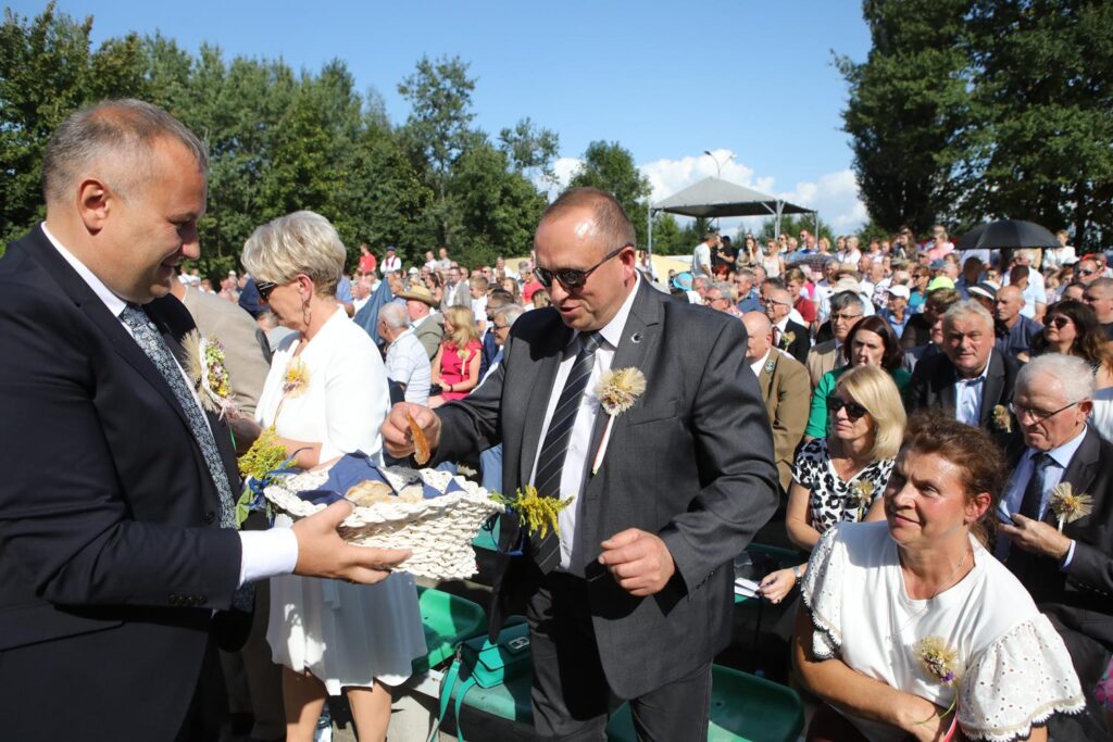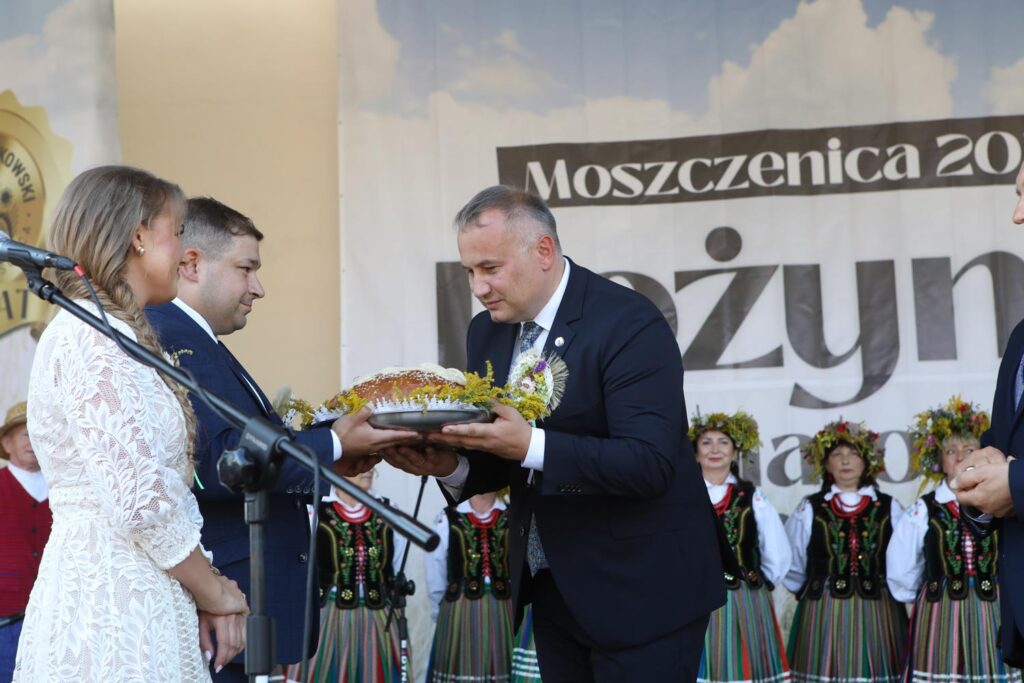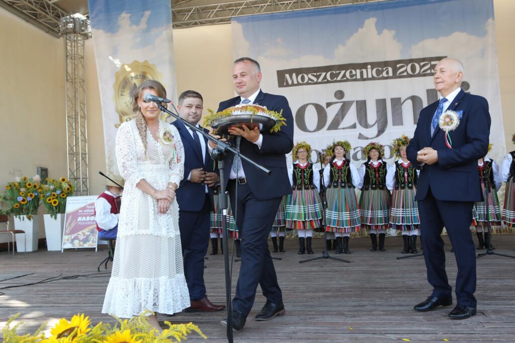 Starostowie dożynek Dominika Misztela z Kamocinka i Kamil Mirowski z Rękoraja obdarowali gospodarzy – Starostę Powiatu Piotrkowskiego Piotra Wojtysiaka i Wójta Gminy Moszczenicy Marcelego Piekarka.