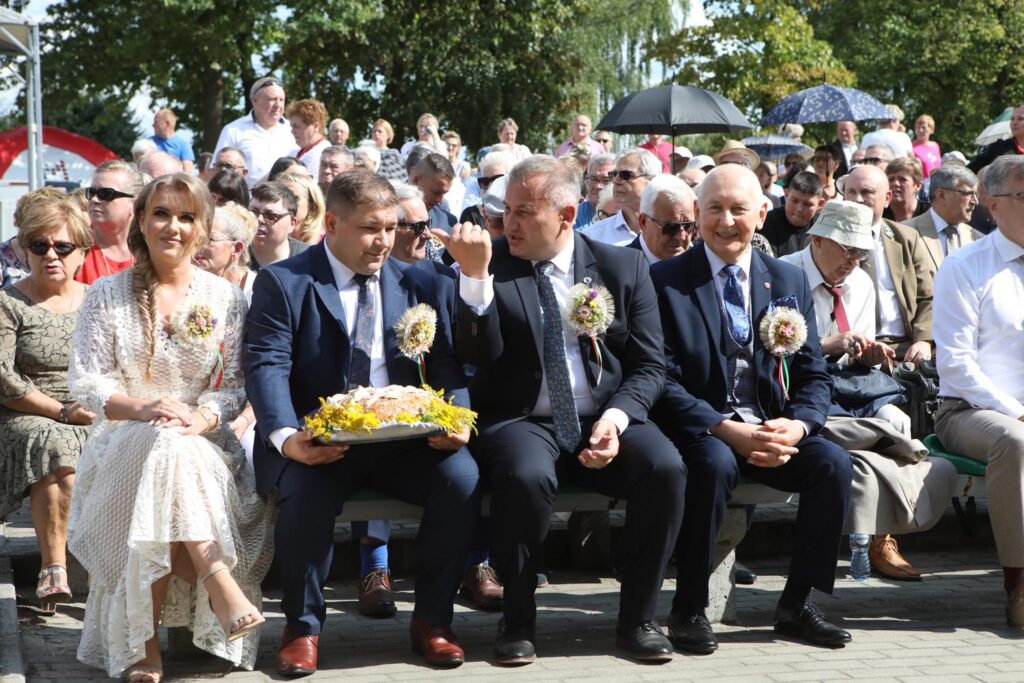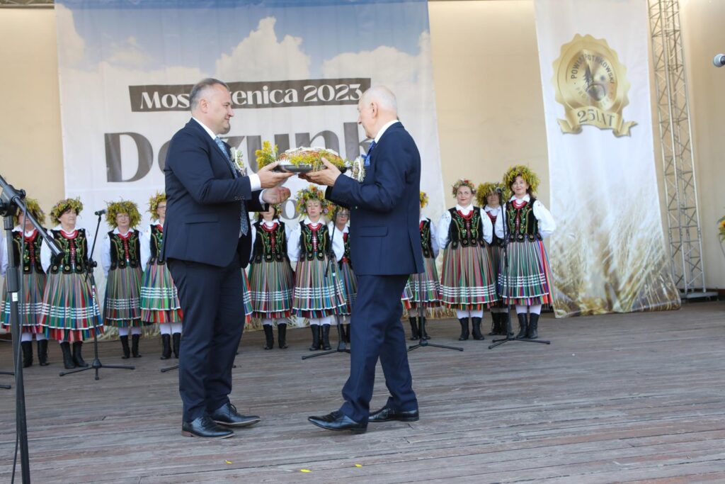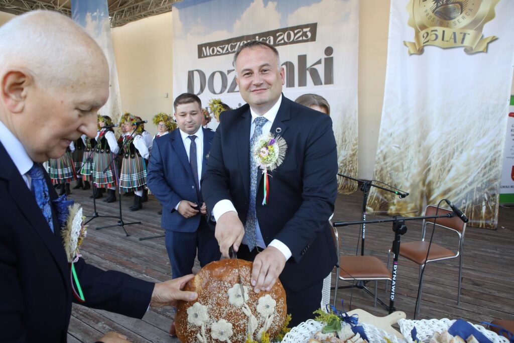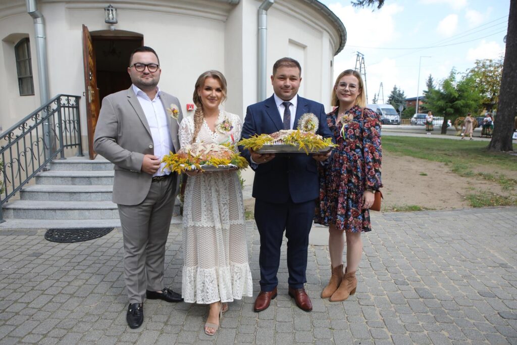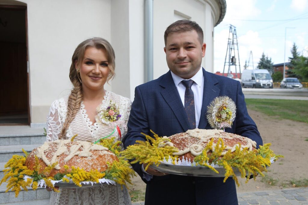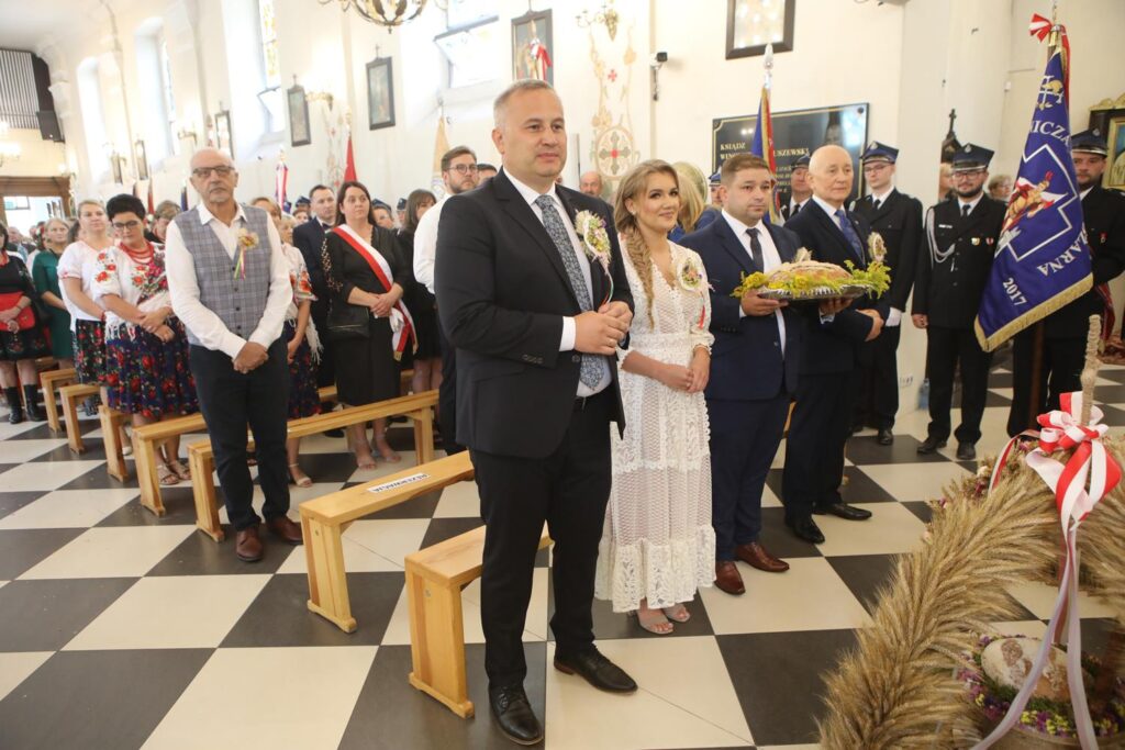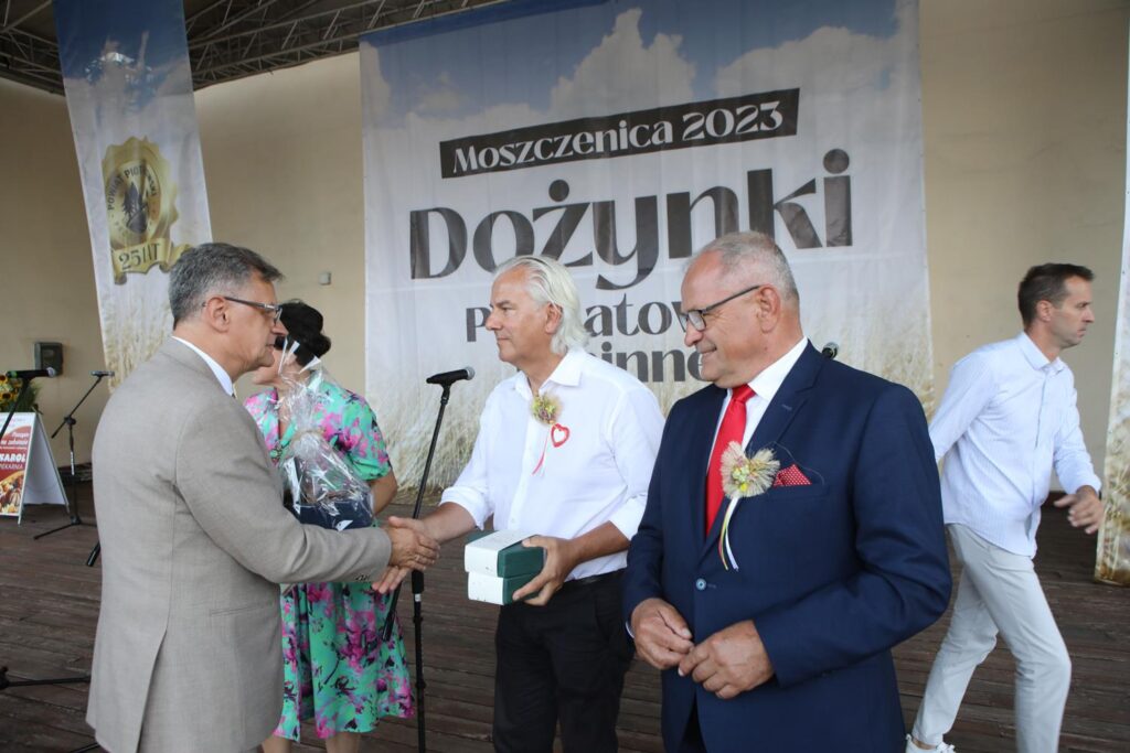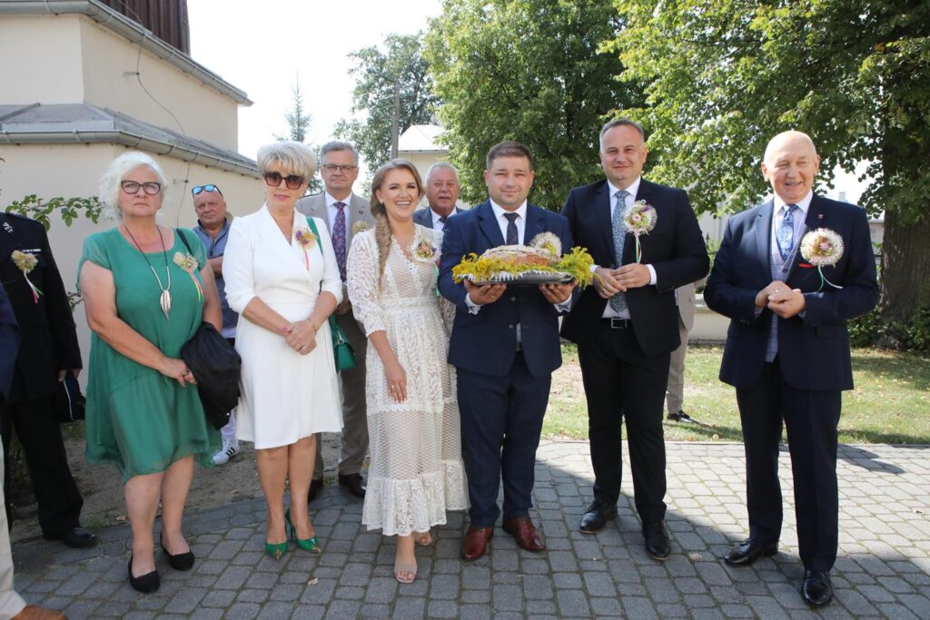 Starostowie dożynek Dominika Misztela z Kamocinka i Kamil Mirowski z Rękoraja obdarowali gospodarzy – Starostę Powiatu Piotrkowskiego Piotra Wojtysiaka i Wójta Gminy Moszczenicy Marcelego Piekarka.