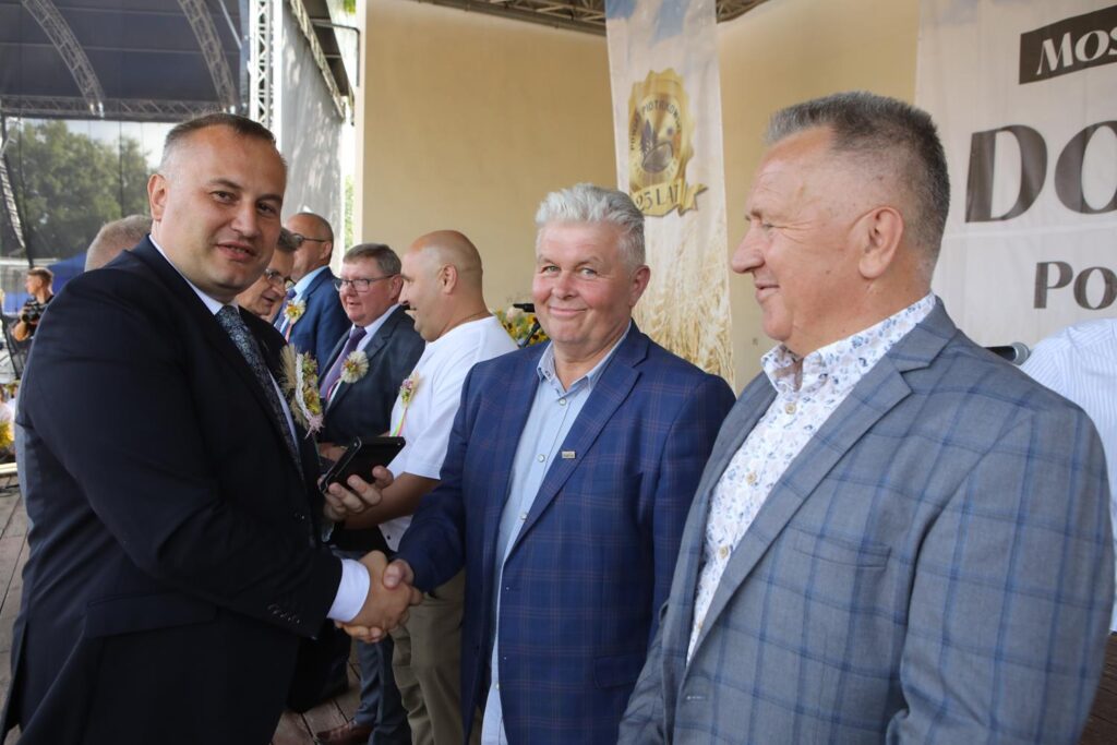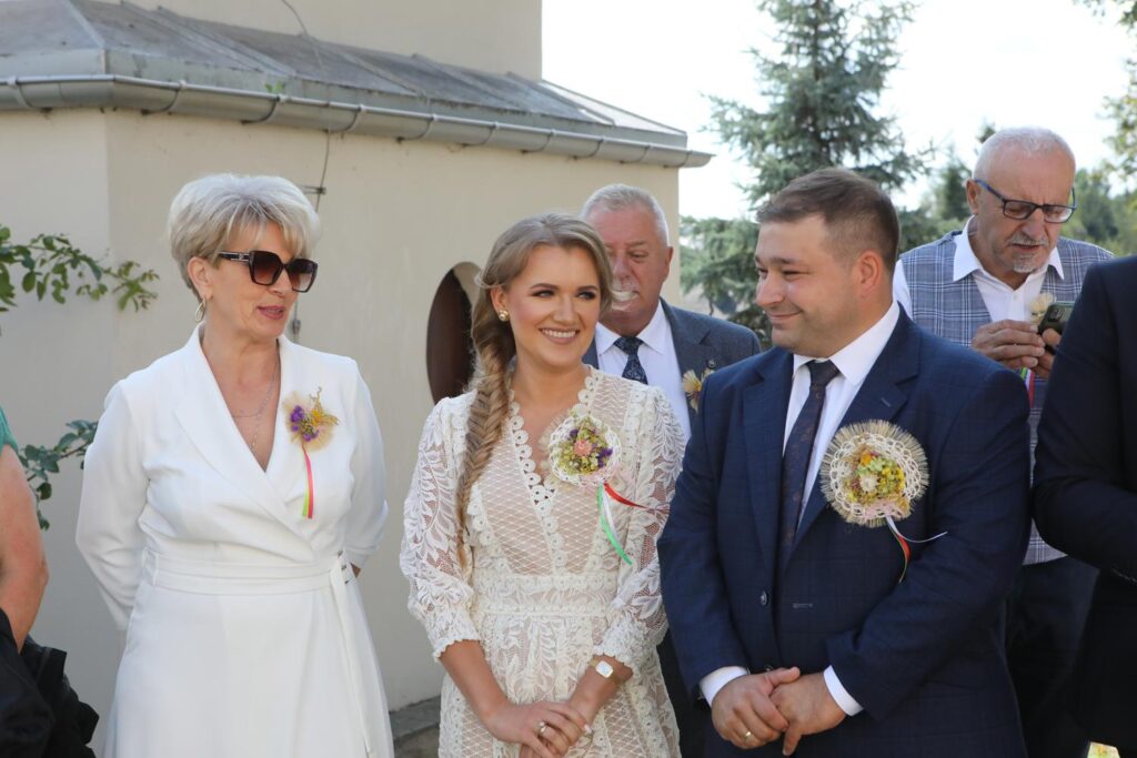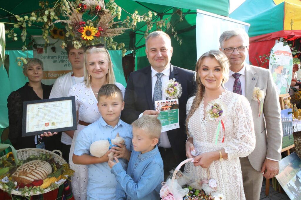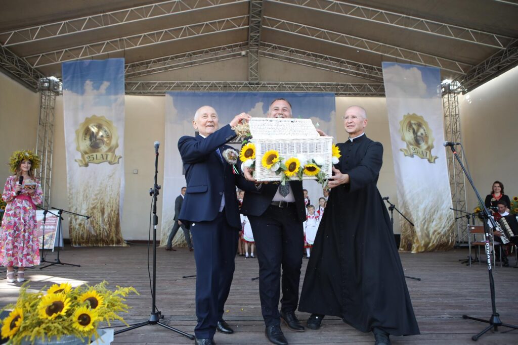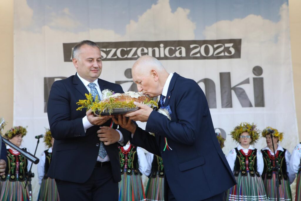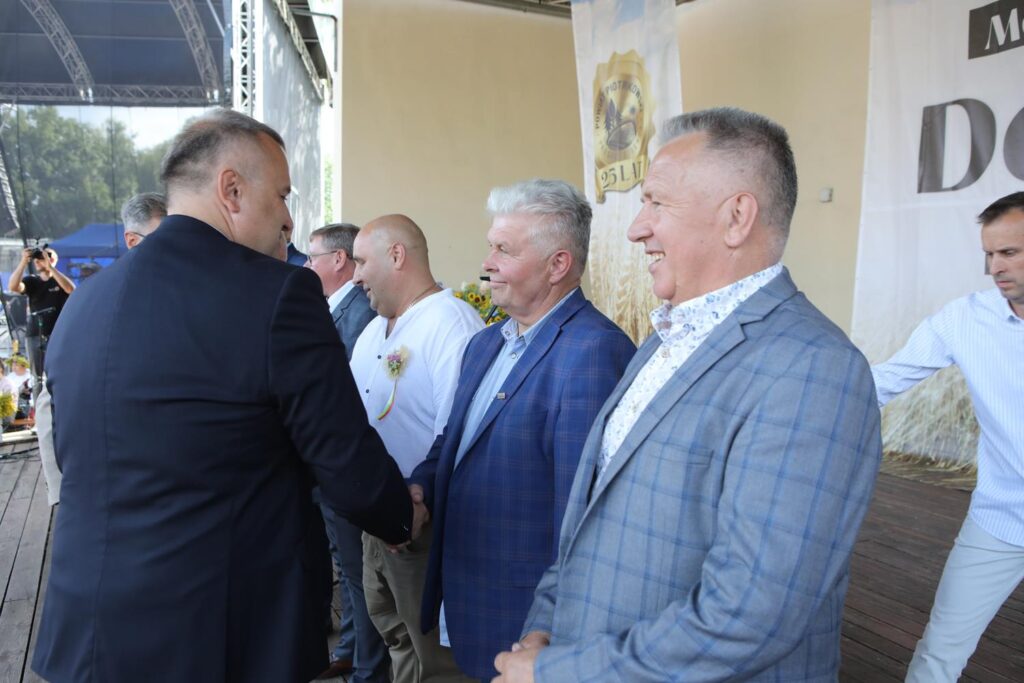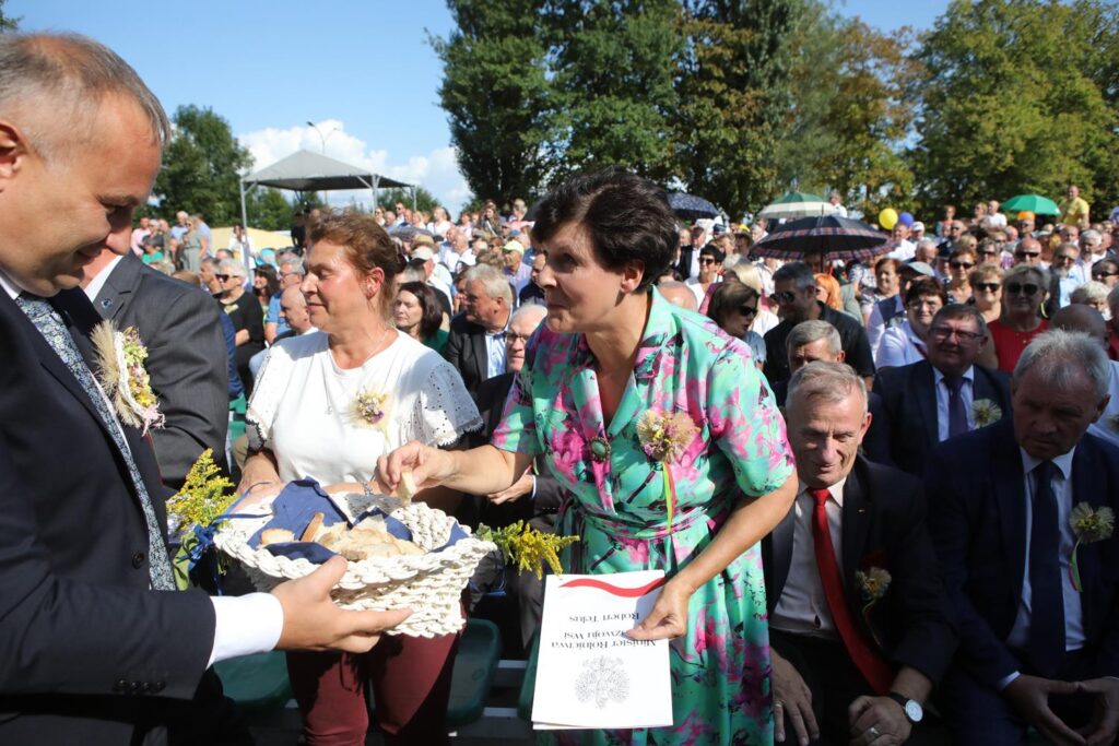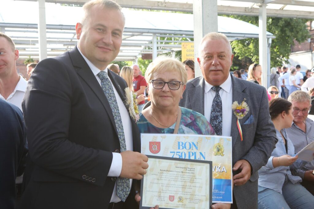 Starostowie dożynek Dominika Misztela z Kamocinka i Kamil Mirowski z Rękoraja obdarowali gospodarzy – Starostę Powiatu Piotrkowskiego Piotra Wojtysiaka i Wójta Gminy Moszczenicy Marcelego Piekarka.