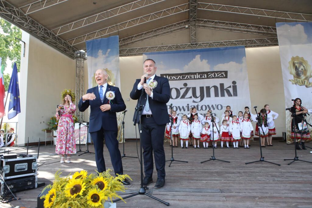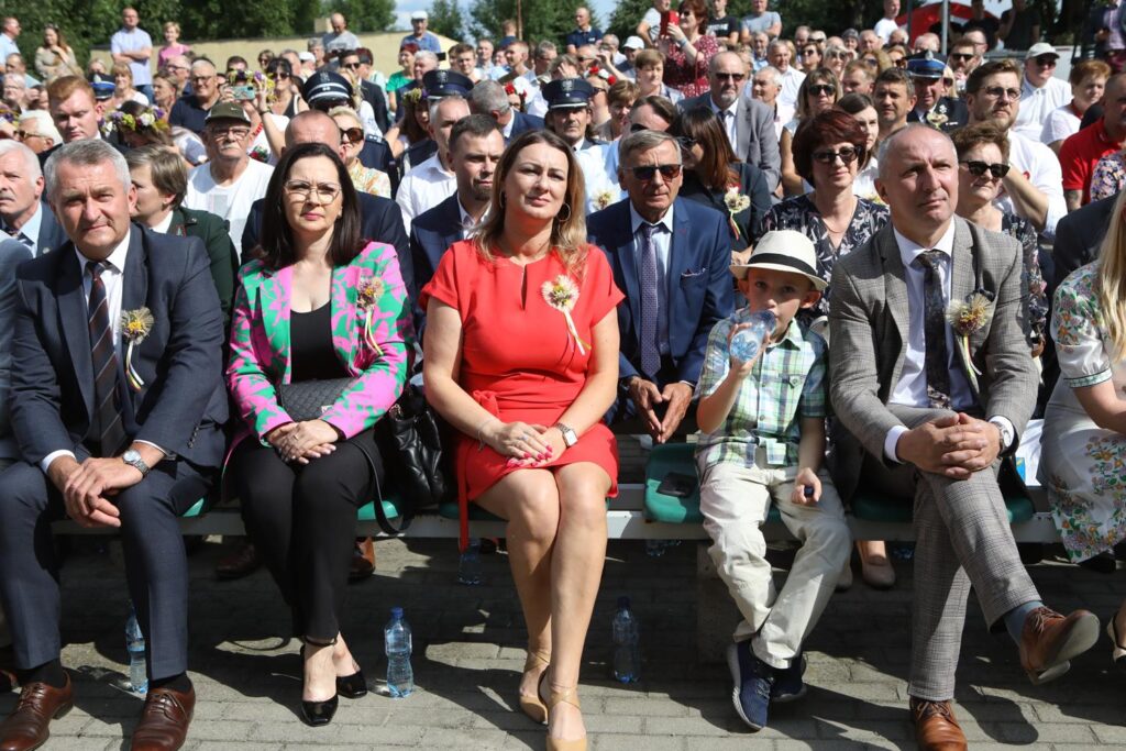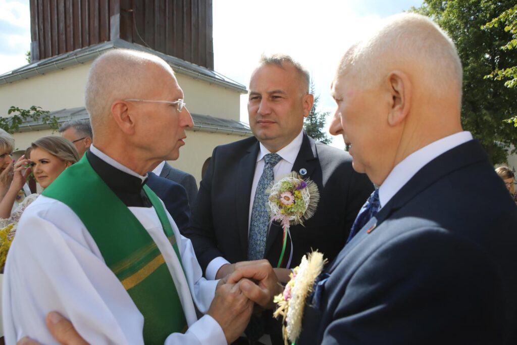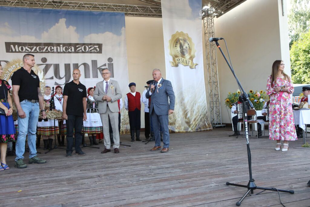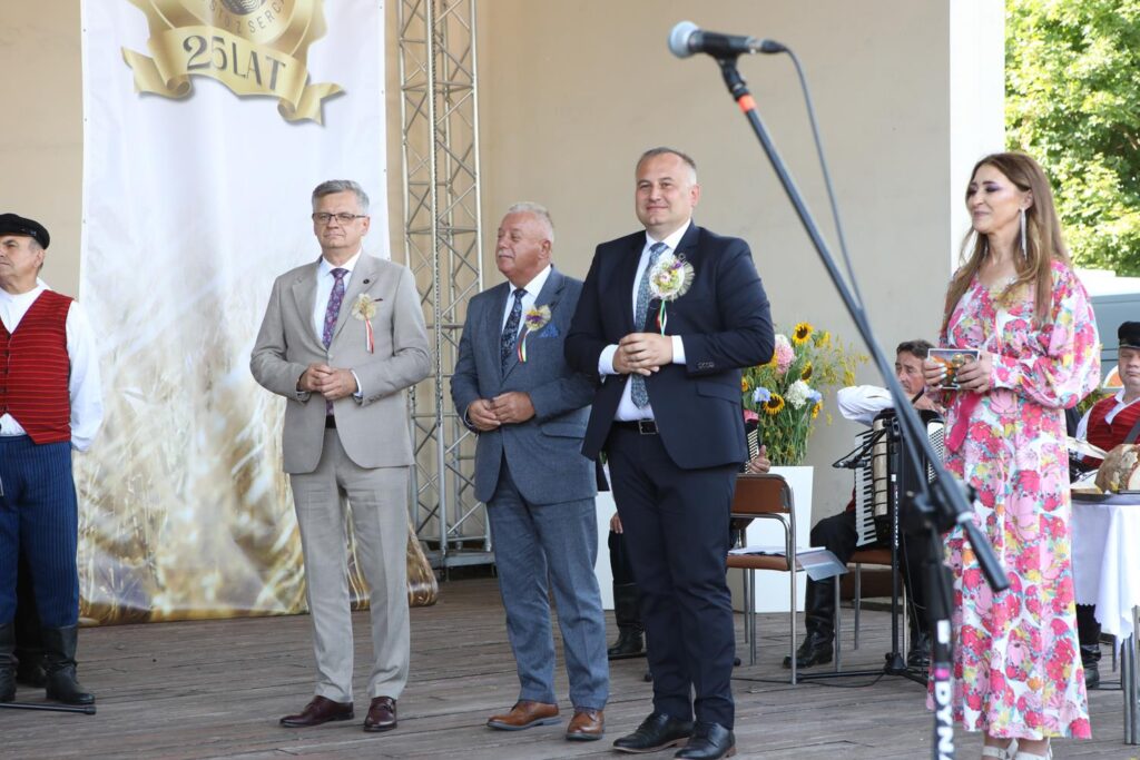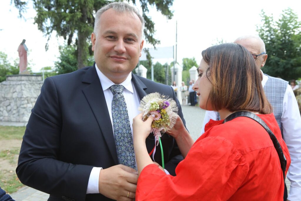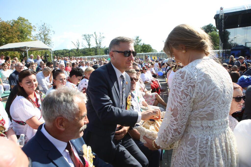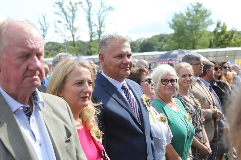 Starostowie dożynek Dominika Misztela z Kamocinka i Kamil Mirowski z Rękoraja obdarowali gospodarzy – Starostę Powiatu Piotrkowskiego Piotra Wojtysiaka i Wójta Gminy Moszczenicy Marcelego Piekarka.