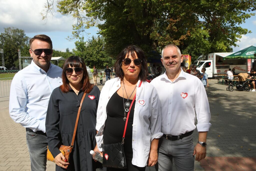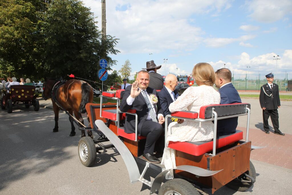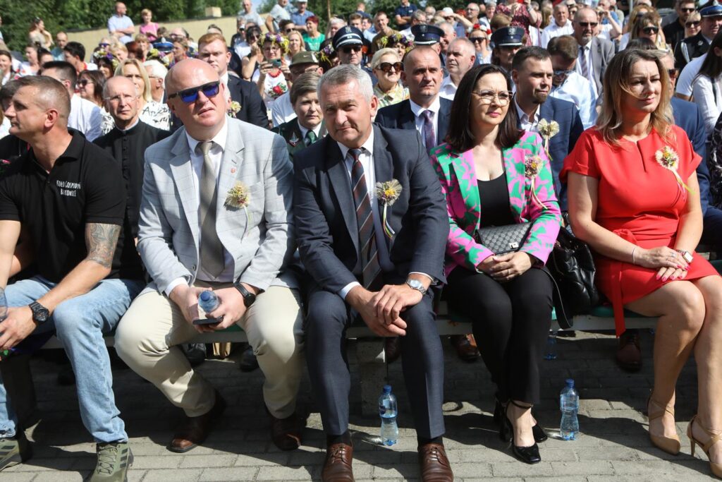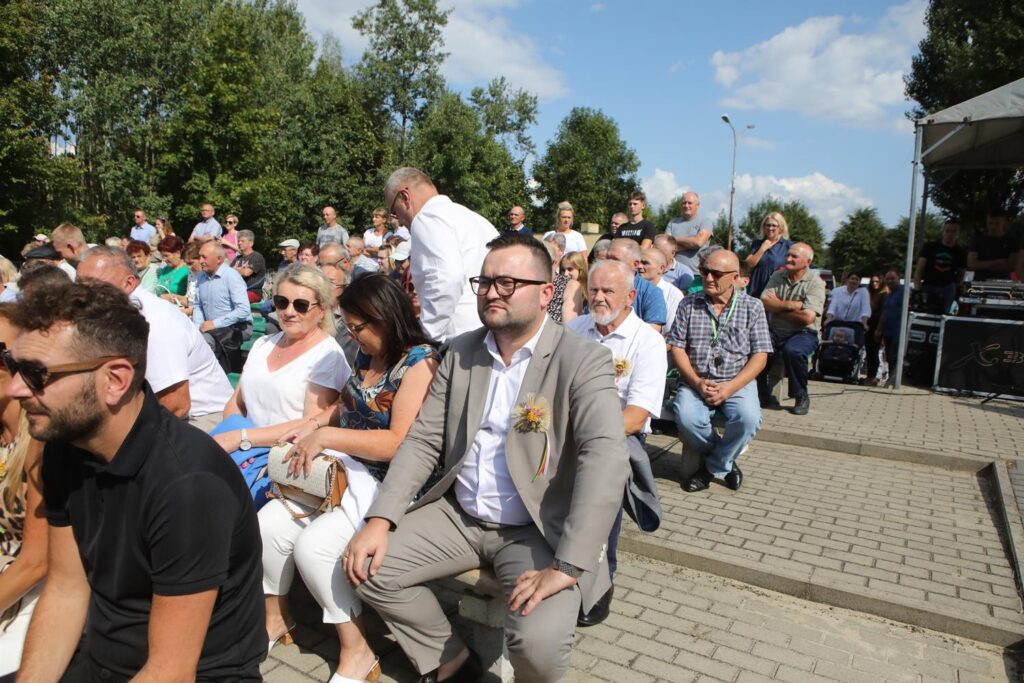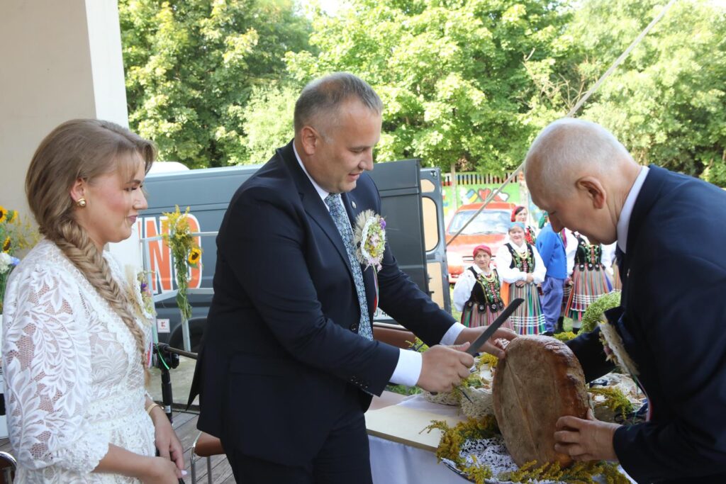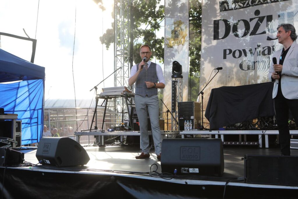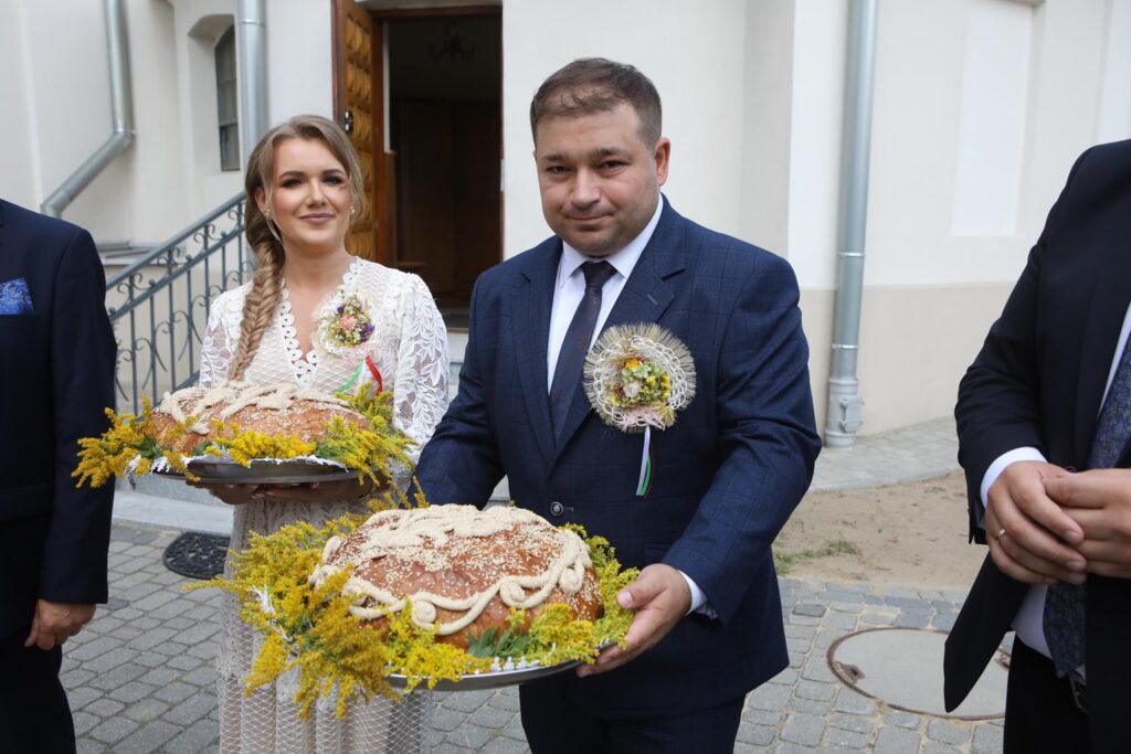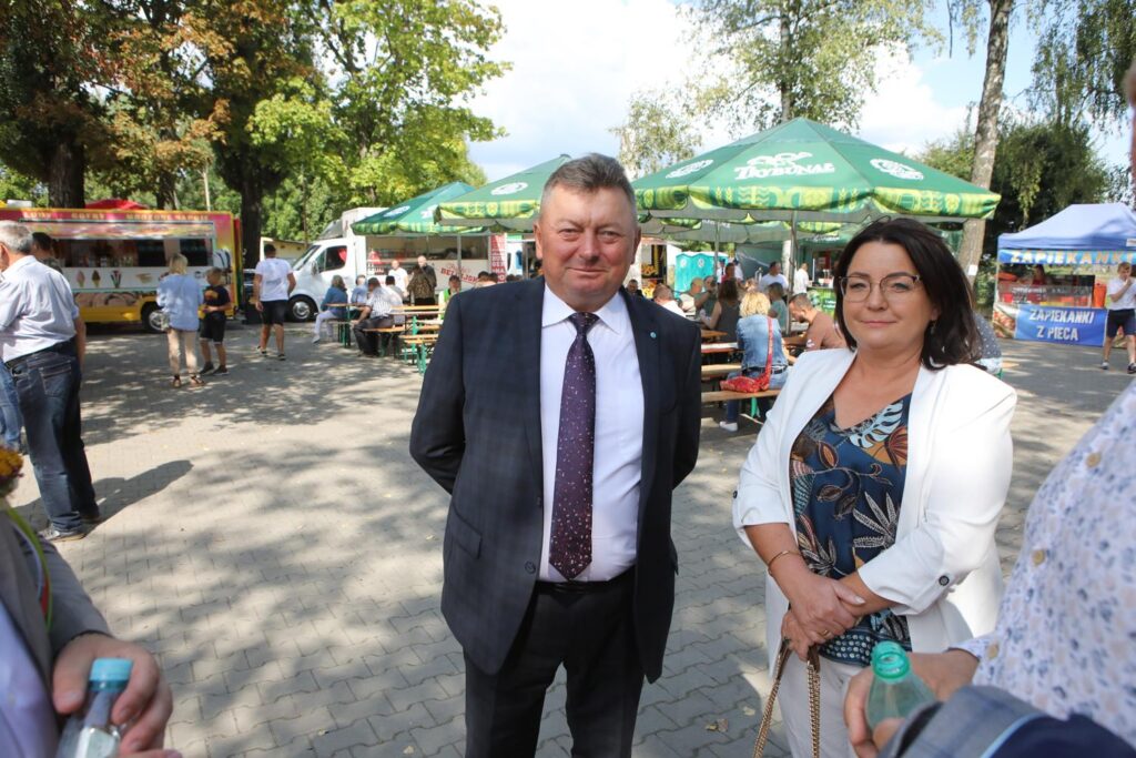 Starostowie dożynek Dominika Misztela z Kamocinka i Kamil Mirowski z Rękoraja obdarowali gospodarzy – Starostę Powiatu Piotrkowskiego Piotra Wojtysiaka i Wójta Gminy Moszczenicy Marcelego Piekarka.