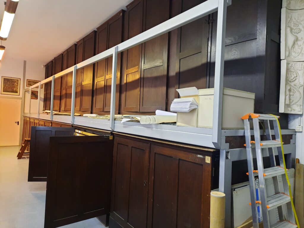- Pomieszczenie i szafy, w których obecnie przechowywane są w Zakładzie Architektury Polskiej na Politechnice Warszawskiej zbiory pomiarowe Warszawy, które w grudniu 1944 roku do Piotrkowa przywiózł Bohdan Guerquin.