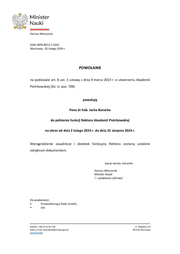 Z informacji do których dotarliśmy wynika, że Dariusz Rogut nie jest już rektorem Akademii Piotrkowskiej. Rezygnację już w piątek (02.02) złożył do właściwego ministra sam Rogut. Na jego miejsce, tego samego dnia Minister Nauki i Szkolnictwa Wyższego powołał Jacka Bonarka.