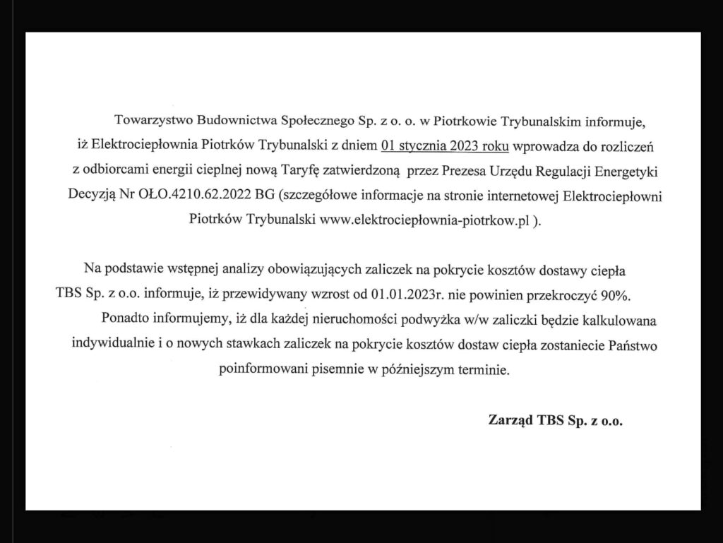 Stowarzyszenie Inicjatywa Piotrkowska 22, złożyła w magistracie petycję do prezydenta miasta „o pilne podjęcie działań i wykorzystanie posiadanych przez prezydenta narzędzi nadzorczych nad miejską spółką (Elektrociepłownia Piotrków Trybunalski) zmierzających do przeliczenia i obniżenia planowanej stawki za dostarczanie ciepła i ciepłej wody użytkowej”. Zdaniem członków IP22, podwyżka cen o blisko 100% od 1 stycznia, „stanowi poważne zagrożenie dla budżetów piotrkowskich rodzin”.