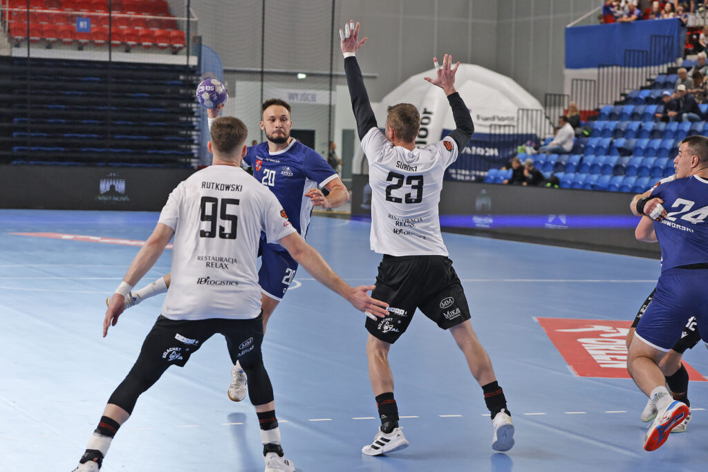 Pierwsza połowa miała dwa oblicza. Początek zdecydowanie należał do miejscowych, którzy w 5. minucie prowadzili już trzema bramkami (5:2). Nic w tym momencie nie wskazywało, że gospodarze mogą mieć dziś problem z odniesieniem zwycięstwa. Ale po bardzo udanym początku w grze miejscowych pojawiły się błędy techniczne w ataku, co skrzętnie wykorzystali rywale. W 12. minucie po dwóch z rzędu trafieniach Rutkowskiego na tablicy wyników widniał remis po 8. Kiedy w 15. minucie Jarosiewicz znów wyprowadził Azoty na dwubramkowe prowadzenie wydawało się, że podopieczni Patryka Kuchczyńskiego opanowali sytuację. Niestety kolejne błędy i nieskuteczna gra w ofensywie sprawiły, że w 19. minucie goście wyszli pierwszy raz na prowadzenie (11:12). Ostatnie 10 minut to nerwowa gra miejscowych i sukcesywne budowanie przewagi przez gości, którzy pierwszą połowę zakończyli trzybramkowym prowadzeniem.