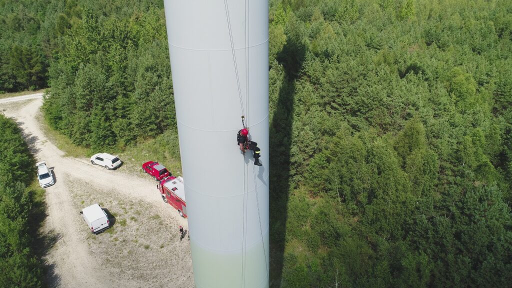 Następnie ratownicy przenieśli się na Farmę Wiatrową Kamieńsk. – Strażacy ze Specjalistycznej Grupy Ratownictwa Wysokościowego Łódź są doskonale przygotowani do pracy na linach. Konieczne jest jednak regularne przeprowadzanie symulacji akcji ratunkowej w tak specjalistycznych miejscach jakimi są wiatraki. To ma bezpośredni wpływ na późniejsze działania w sytuacji realnego zagrożenia. W przyszłości chcielibyśmy, by ćwiczenia – choć w zakresie podstawowym – przeprowadzali tu także strażacy z Ochotniczej Straży Pożarnej – mówi Dariusz Stańczak, ekspert do spraw ratownictwa wysokościowego w Komendzie Wojewódzkiej PSP w Łodzi.