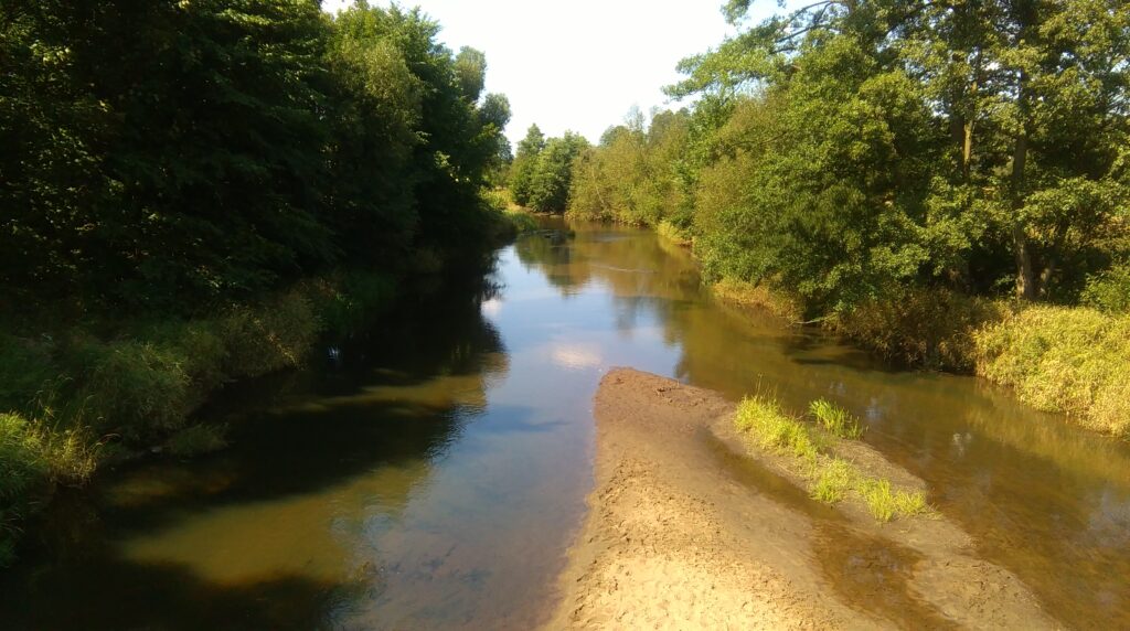 Filmową wersję „Wiernej rzeki” Tadeusz Chmielewski w znacznej części zrealizował na terenie obecnego powiatu piotrkowskiego. W kadrach dramatu pojawia się między innymi Zalew Sulejowski i rzeka Pilica w okolicach Sulejowa oraz okolice Dąbrowy nad Czarną. To właśnie ta ostatnia z wymienionych lokacja stanowi scenerię pierwszych scen filmu. Po przegranej bitwie ranny Odrowąż szuka pomocy. Trafia do wsi położonej w pobliżu pola bitwy. Tutejsi chłopi nie tylko go przeganiają, ale chcą na postronku zaprowadzić do rosyjskich żołnierzy. Zdesperowany mężczyzna rzuca się ze skarpy w nurt przepływającej obok rzeki.