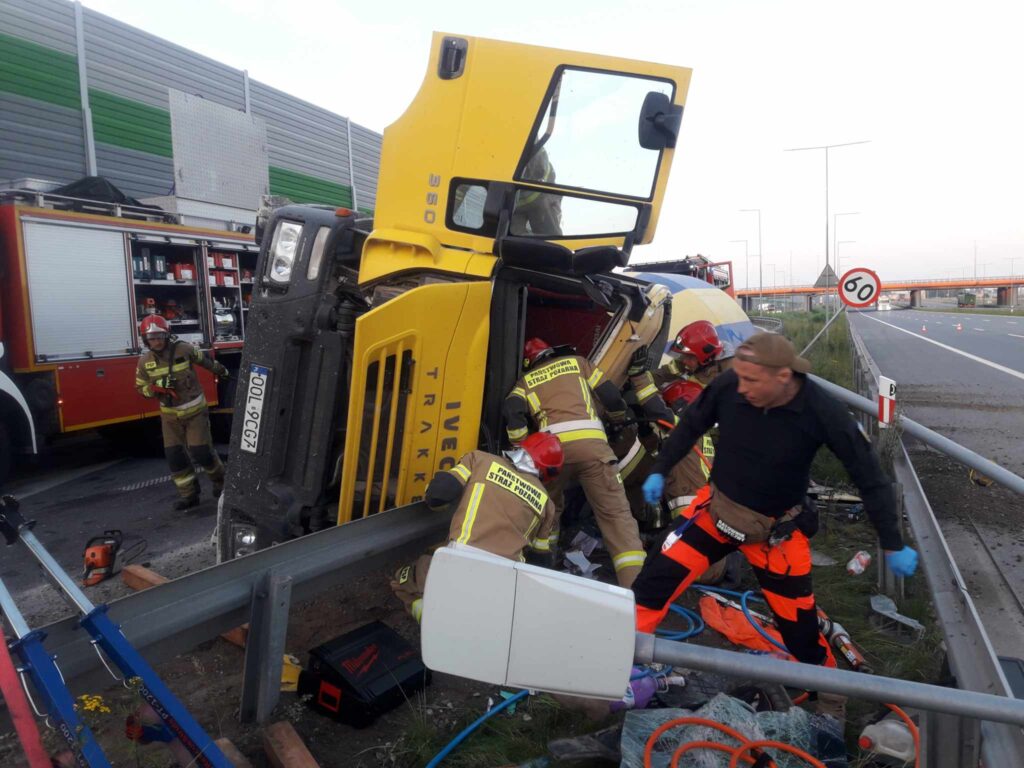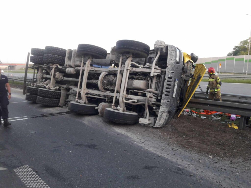 Około 4:30 na autostradzie A1 na węźle Piotrków Trybunalski-Południe na zjeździe z DK74 w kierunku Łodzi i Gdańska, przewróciła się gruszka przewożąca beton. Pojazd uszkodził bariery energochłonne oraz latarnię. Płynny beton wylał się na drogę i do rowu. Kierowcy na szczęście nic się nie stało. Wjazd na autostradę jest zablokowany.