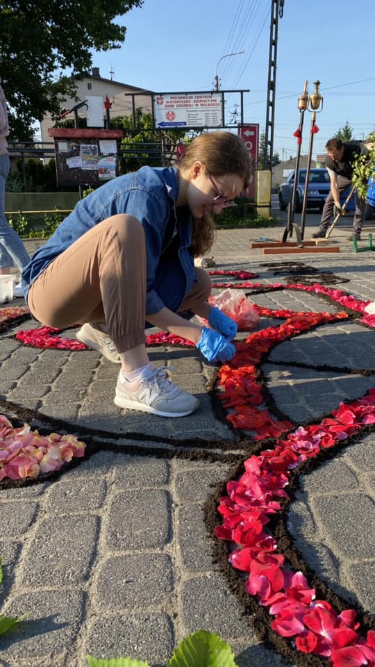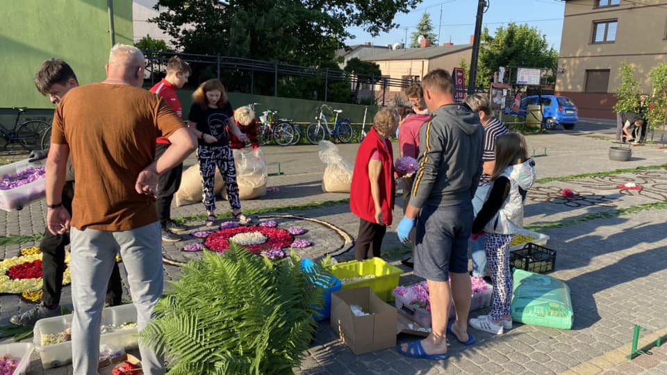 Jak co roku przygotowania i układanie dywanu z kwiatów trwa pełną parą, wczorajsza ulewa troszkę nam przeszkodziła, do późnych godzin nocnych trwało rysowanie projektu, dzisiaj od wczesnego poranka ekipa dzieci, dziewcząt i chłopców, mieszkańców Wolborza oraz strażaków OSP Wolbórz Oczywiście na czele zespołu stoi Andrzej Kotlicki