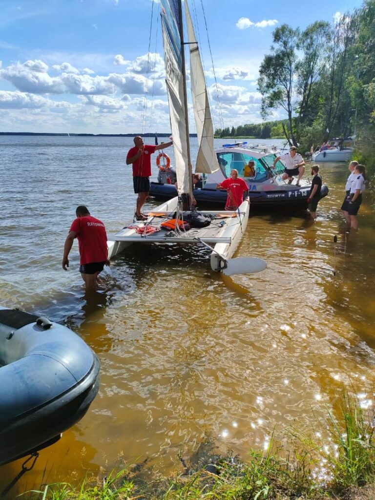 Dwuosobowy katamaran przewrócił się na Zalewie Sulejowskim. Z pomocą przybyli ratownicy Rejonowego WOPR w Piotrkowie Trybunalskim.