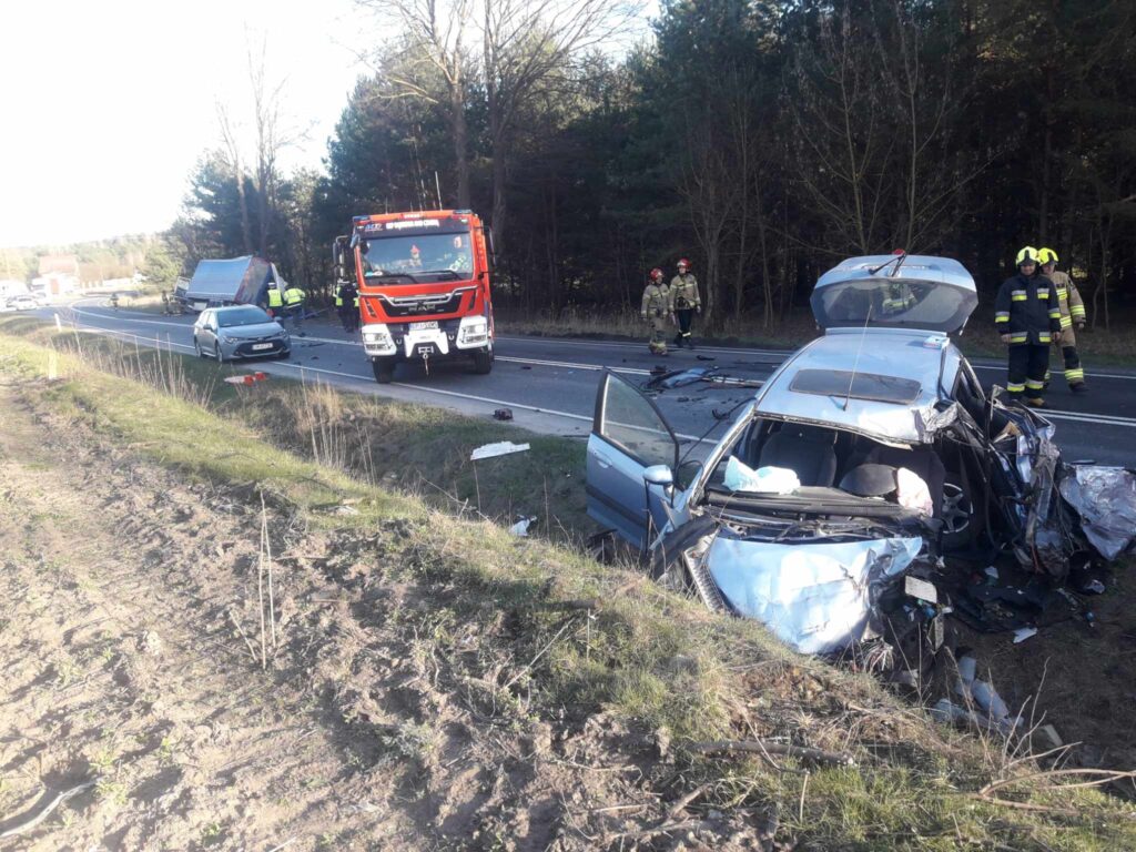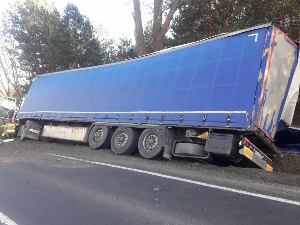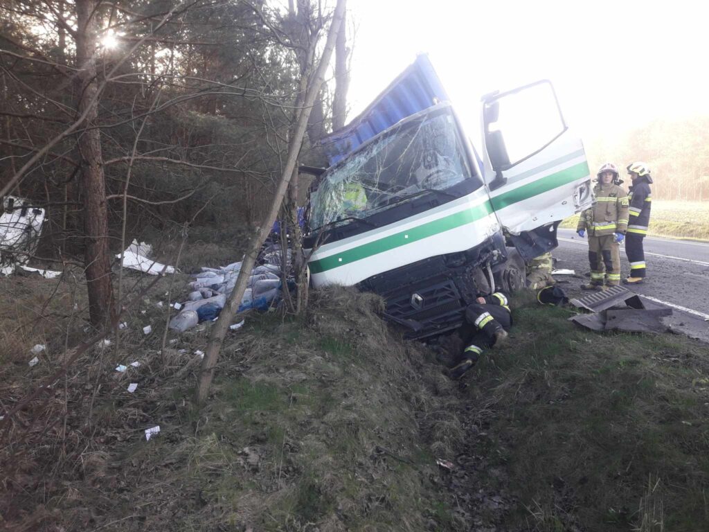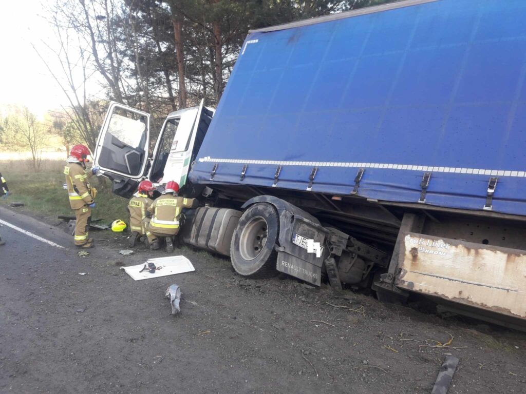 Kierowca ciężarówki, prawdopodobnie ratując się przed zderzeniem, zjechał w prawo i wpadł do rowu. Na miejscu był także śmigłowiec LPR.