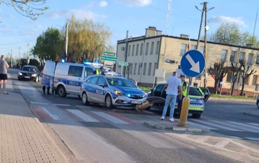 W Moszczenicy radiowóz uderzył w znak drogowy. Policyjny Opel ma uszkodzony przód.