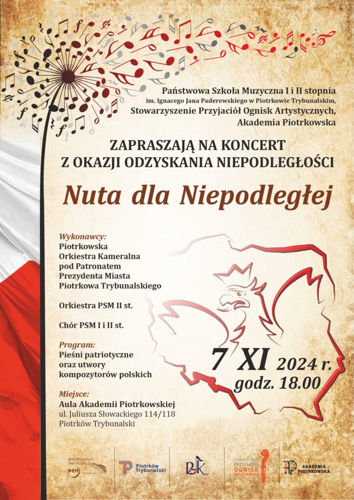 Akademia Piotrkowska, Państwowa Szkoła Muzyczna I i II stopnia im. I.J. Paderewskiego w Piotrkowie Trybunalskim oraz Stowarzyszenie Przyjaciół Ognisk Artystycznych serdecznie zapraszają na koncert „Nuta dla Niepodległej”, który odbędzie się już dziś (07.11) o godz. 18.00 w auli Akademii Piotrkowskiej. Wstęp wolny.