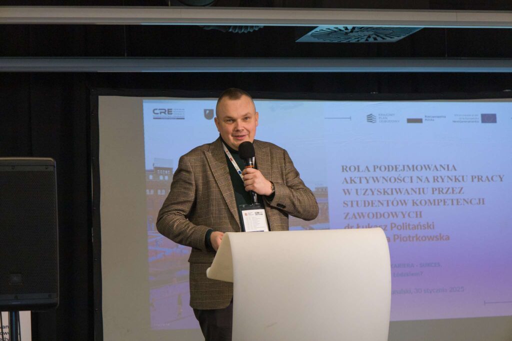 Już od samego rana frekwencja była imponująca – konferencję oficjalnie otwarto o godzinie 9:30, a tuż po niej dr Łukasz Politaniś z Akademii Piotrkowskiej przedstawił prelekcję na temat roli aktywności na rynku pracy w zdobywaniu kompetencji zawodowych.