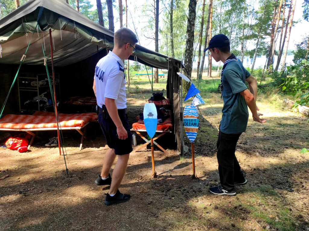 – Wspólne działania miały na celu kontrole obiektów, pod kątem odpowiednich warunków w jakich dzieci i młodzież spędzają wakacje. Mundurowi wraz z wizytatorem sprawdzali prawidłowość przebiegu obozu, kwalifikacje wychowawców oraz kierownika, liczebność grup zgodną z przepisami, a także programy realizowane podczas wypoczynku. Mundurowi w ramach działań „Kręci mnie bezpieczeństwo nad wodą” mieli też możliwość porozmawiania z młodzieżą o zasadach bezpieczeństwa podczas wypoczynku przy akwenach oraz w lesie. Policjanci porozmawiali z najmłodszymi jak wezwać pomoc i co należy zrobić kiedy zgubią się w lesie. Przypomnieli też o podstawowych zasadach bezpieczeństwa podczas kąpieli w zbiornikach wodnych, a także podczas korzystania ze sprzętu wodnego. Poruszony został również temat, co należy zrobić w przypadku zgubienia się, np. na plaży.