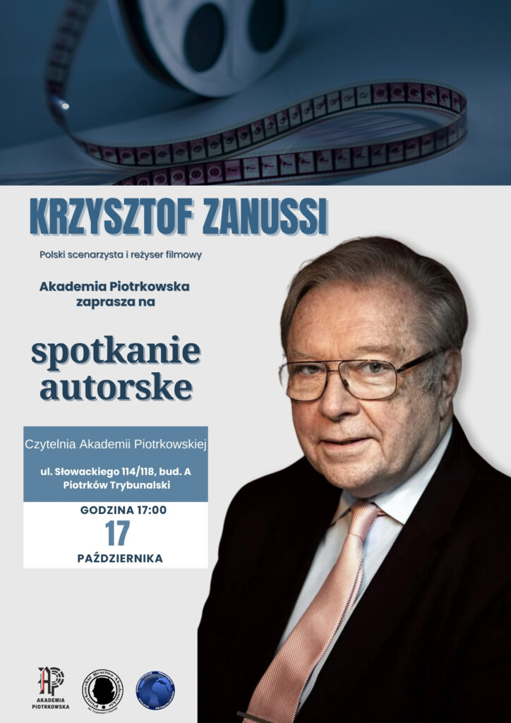 Akademia Piotrkowska zaprasza na najbliższy czwartek (17.10) na spotkanie autorskie z reżyserem, scenarzystą oraz producentem filmowym Krzysztofem Zanussim. Początek o godz.17.00,