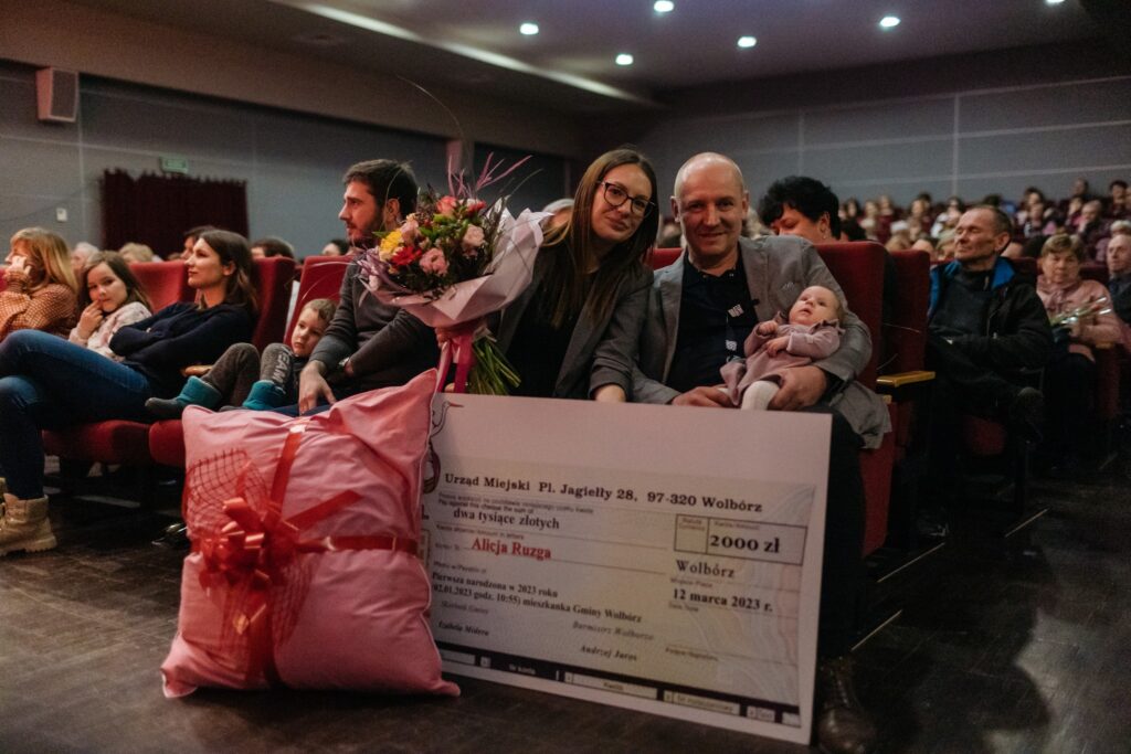 Mała Alicja Ruzga wraz z rodzicami Edytą i Rafałem odebrali od Burmistrza Wolborza Andrzeja Jarosa kartę podarunkową o wartości 2000 zł, dużą poduchę i kwiaty. To pierwsza mieszkanka gminy, która przyszła na świat w tym roku – pisaliśmy o tym TUTAJ. W WCK odbył się okolicznościowy koncert.