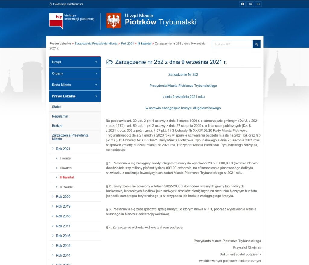 W Biuletynie Informacji Publicznej piotrkowskiego magistratu, pojawiło się zarządzenie w sprawie zaciągnięcia kredytu długoterminowego. Jak czytamy w dokumencie, środki mają być przeznaczone na sfinansowanie planowanego deficytu, w związku z realizacją zadań inwestycyjnych miasta. Kredyt ma być spłacony do 2033 roku między innymi z dochodów własnych gminy a w przypadku ich braku z zaciągniętego kredytu. Jako zabezpieczenie, miasto wystawi weksel in blanco z deklaracją wekslową.