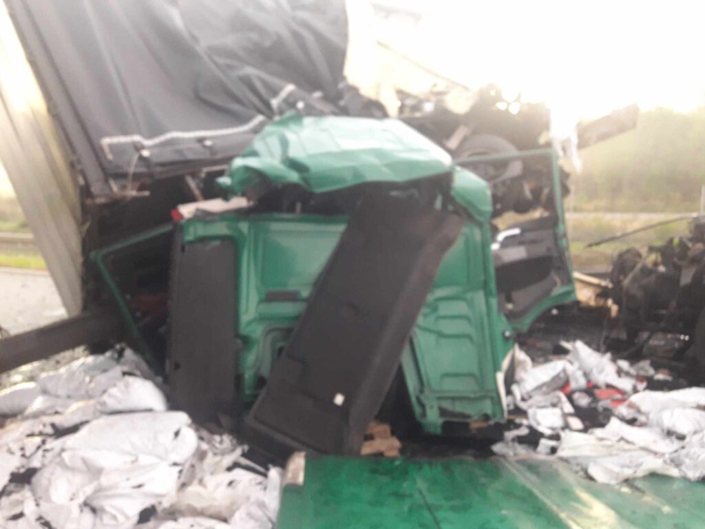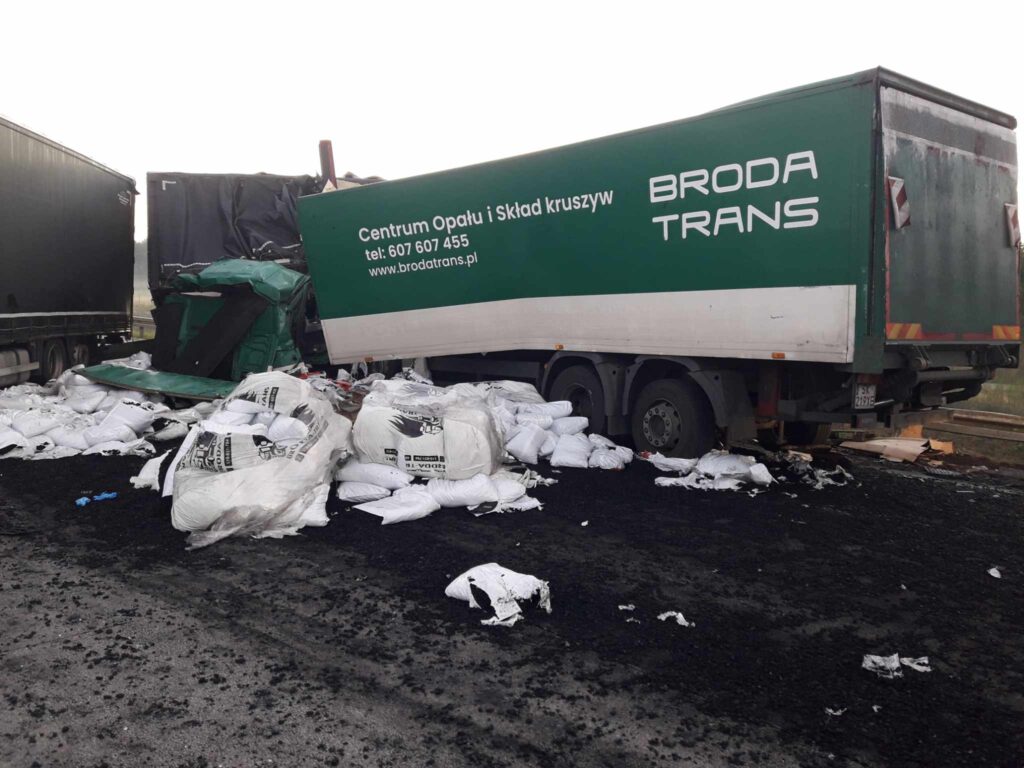 Jedna z ciężarówek przewoziła części samochodowe a druga węgiel w workach. Podczas zderzenia, węgiel rozsypał się na jezdnię. Kabina pojazdu została kompletnie zmiażdżona. Kierowca i pasażer zostali przewiezieni na badania do radomszczańskiego szpitala. Z nieoficjalnych informacji wiemy, że ich życiu nie zagraża niebezpieczeństwo.