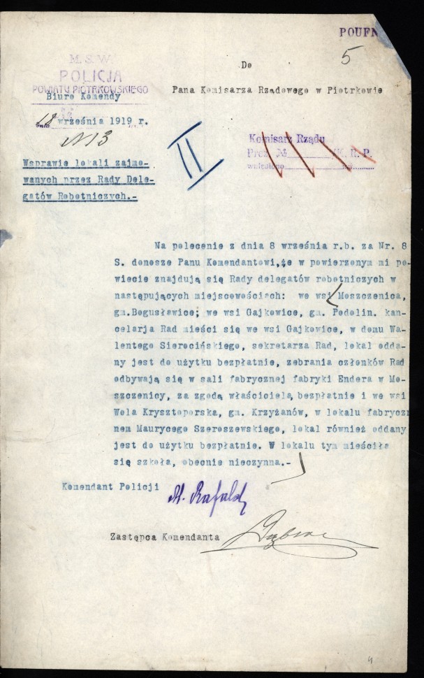 Nie inaczej było w przypadku RDR w Piotrkowie i w okolicznych miejscowościach. Początkowo współtworzyli je działacze Komunistycznej Partii Robotniczej Polski (KPRP) i Polskiej Partii Socjalistycznej (PPS). Szybko jednak władze PPS stanowiącej większość w RDR zdecydowały o zawieszeniu współpracy z komunistami, skazując tym samy rady na utratę znaczenia i w konsekwencji rozpad. Postawa komunistów identyfikowana przez polskie władze państwowe jako agentura bolszewicka spowodowała, iż działalnością RDR szybko zainteresowały się organy bezpieczeństwa. Pozostałością monitorowania poczynań rad jest dokumentacja związana z określeniem składu lub lokalizacji poszczególnych RDR w mieście i powiecie piotrkowskim. Archiwum Państwowe zachęca do zapoznania się z jednym z dokumentów ukazujących ten aspekt dziejów regionu w czasie wojny polsko-bolszewickiej.