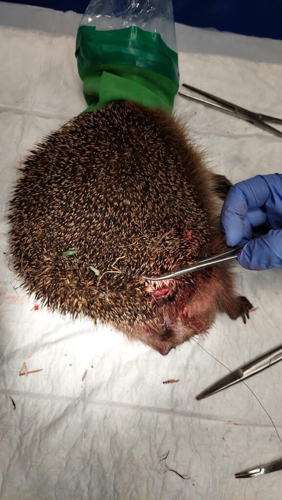 Pracujemy… Jeż podczas hibernację jest właściwie bezbronny. Ten znaleziony przez psa, z dużym płatem zerwanej skóry, trafił popołudniu do naszego ośrodka. Właśnie kończy się „zszywanie” pechowca.