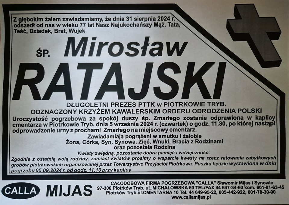 Nie żyje Mirosław Ratajski – długoletni prezes PTTK w Piotrkowie. Odznaczony Krzyżem Kawalerskim Orderu Odrodzenia Polski. Uroczystość pogrzebowa odbędzie się w czwartek (05.09) o godzinie 11:30 w kaplicy cmentarnej w Piotrkowie. Mirosław Ratajski zmarł 31 sierpnia, miał 77 lat.