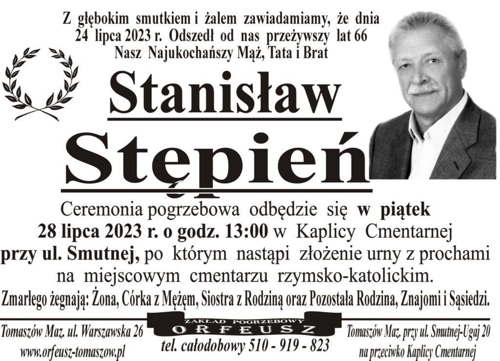 Pogrzeb Stanisława Stępnia odbędzie się w piątek 28 lipca o godzinie 13:00 w kaplicy cmentarnej przy ulicy Smutnej w Tomaszowie Mazowieckim.