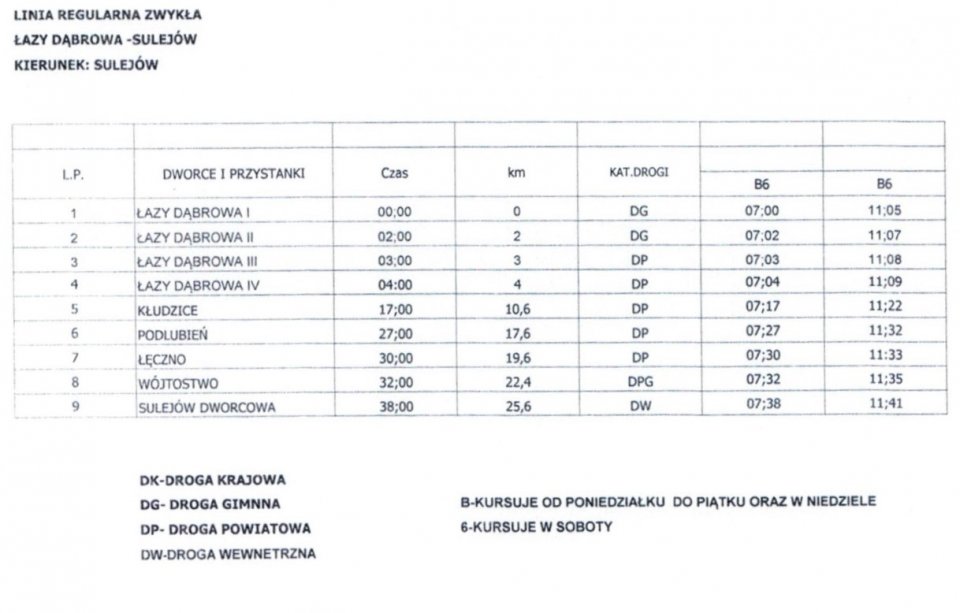 Od 1 sierpnia, ta pierwsza trasa ma przebiegać od Łazów-Dąbrowy przez Kłudzice, Podlubień, Łęczno, Wójtostwo do Sulejowa, do ulicy Dworcowej i z powrotem, a rozkłady jazdy wkrótce pojawią się na przystankach.