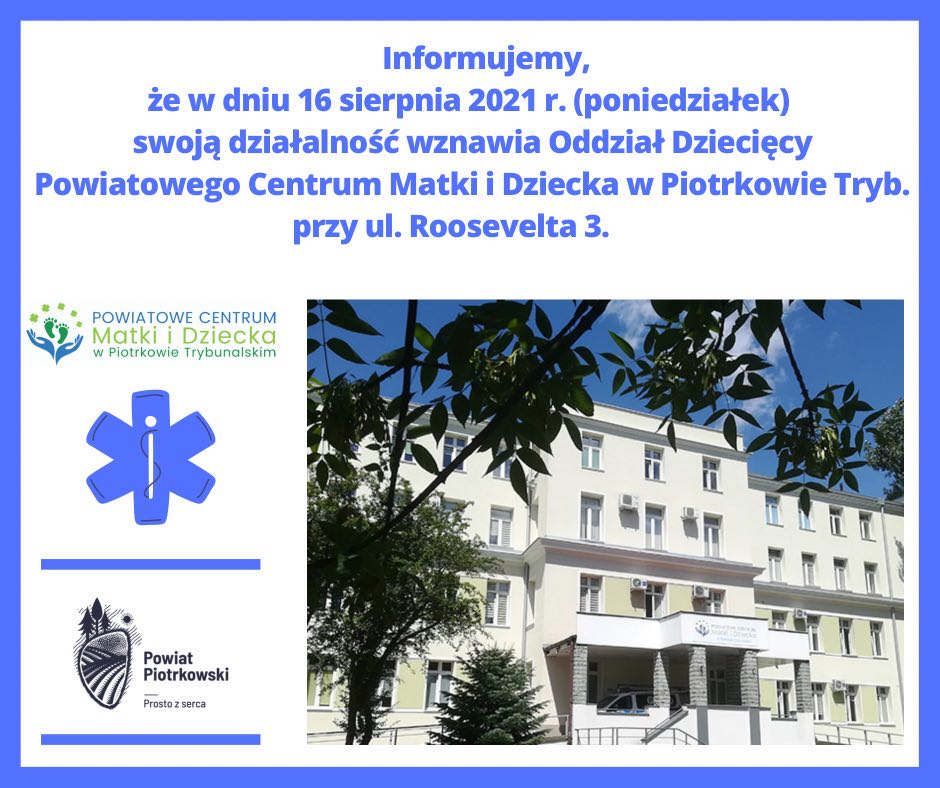 Dwa tygodnie wcześniej niż pierwotnie planowano otwarty zostanie Oddział Dziecięcy w PCMiD w Piotrkowie. Po półtoramiesięcznej przerwie Oddział Dziecięcy Powiatowego Centrum Matki i Dziecka w Piotrkowie, od poniedziałku 16 sierpnia, znów będzie przyjmował małych pacjentów. W razie jakikolwiek pytań należy kontaktować się z sekretariatem oddziału pod nr telefonu 44 645 11 67 lub Dziecięcą Izbą Przyjęć tel. 44 649 72 35.