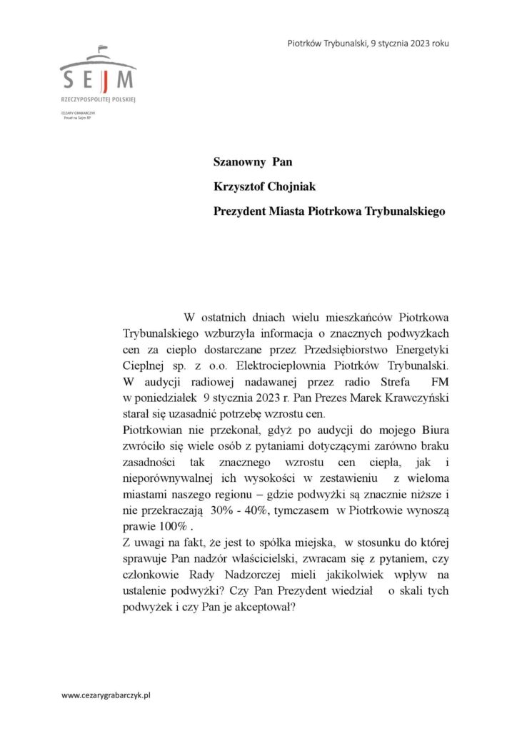 Z kolei poseł Cezary Grabarczyk z Platformy Obywatelskiej dopytywał między innymi o wynagrodzenie prezesa ciepłowni Marka Krawczyńskiego, oraz o świadomość prezydenta co do wielkości podwyżek za ogrzewanie.