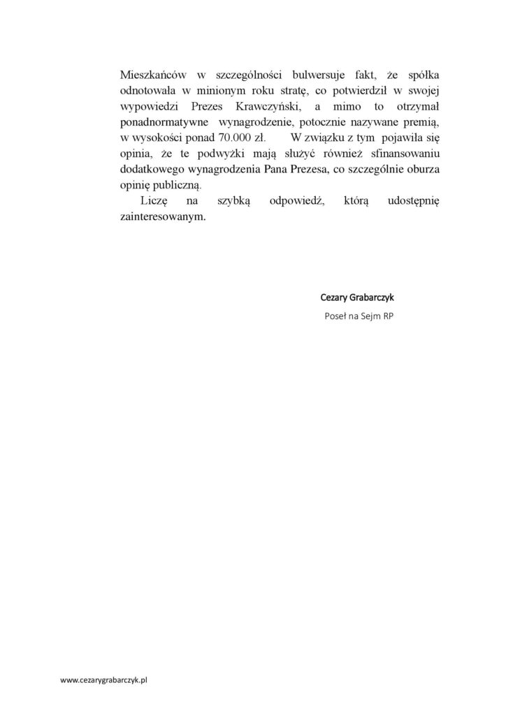 Mieszkańców w szczególności bulwersuje fakt, że spółka odnotowała w minionym roku stratę, co potwierdził w swojej wypowiedzi Prezes Krawczyński, a mimo to otrzymał ponadnormatywne wynagrodzenie, potocznie nazywane premią, w wysokości ponad 70.000 zł. W związku z tym pojawiła się opinia, że te podwyżki mają służyć również sfinansowaniu dodatkowego wynagrodzenia Pana Prezesa, co szczególnie oburza opinię publiczną – pisze poseł Cezary Grabarczyk.