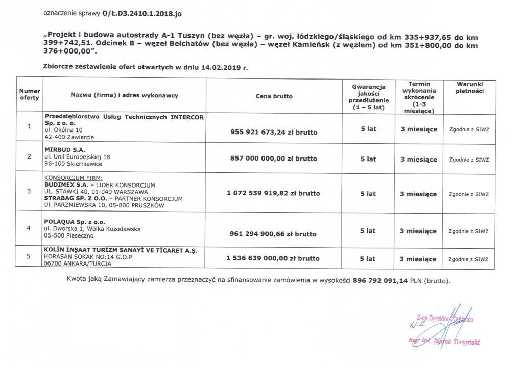 Wpłynęło pięć ofert. Najniższa z nich opiewa na 857 mln zł, a najwyższa na ponad 1,5 mld zł, przy wartości kosztorysu blisko 897 mln zł. Komisja przetargowa bada oferty, a wybór najkorzystniejszej oferty poznamy prawdopodobnie w kwietniu.
