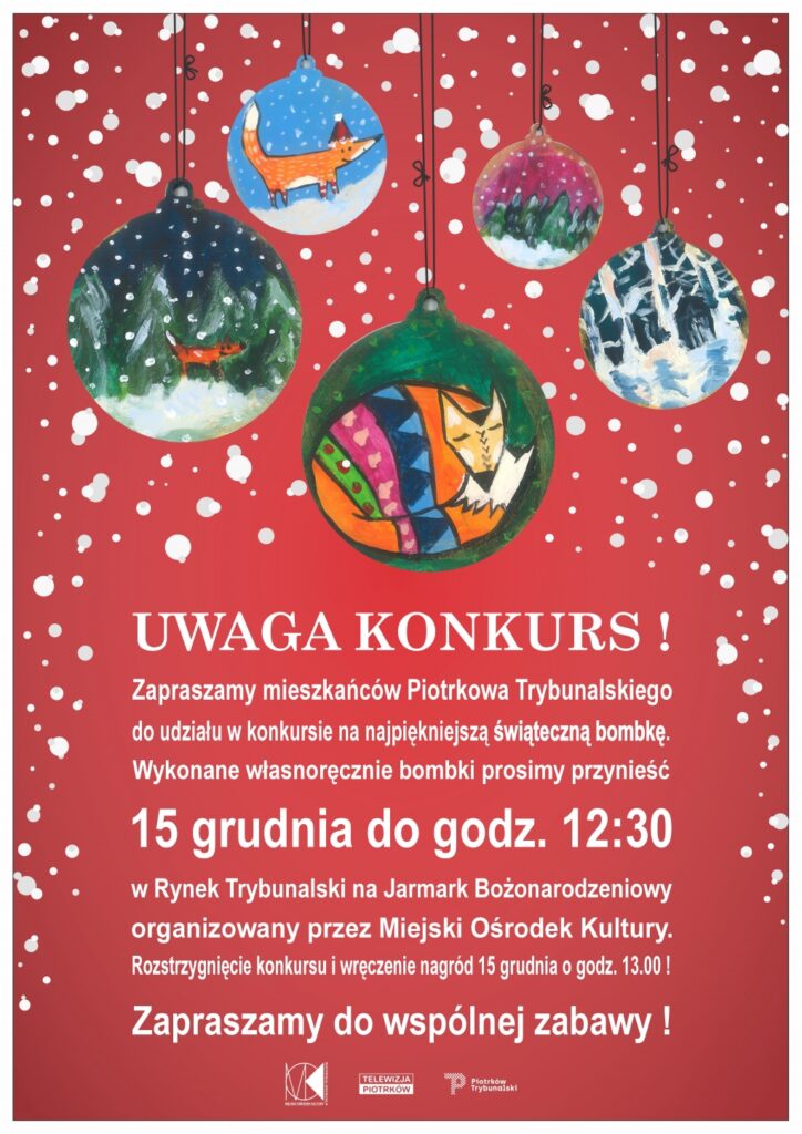Podczas jarmarku odbędzie się również konkurs na najpiękniejszą bombkę świąteczną (rozstrzygnięcie ok.13.00). Dla zwycięzców przewidziano wyjątkowe nagrody, w tym ręcznie zdobione bombki produkowane przez piotrkowską firmę Szkło-Dekor – znaną na całym świecie z unikalnych dekoracji.