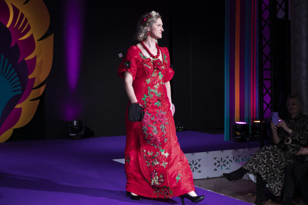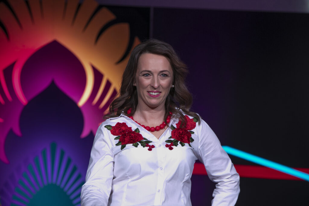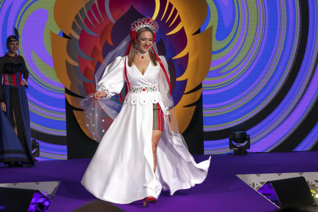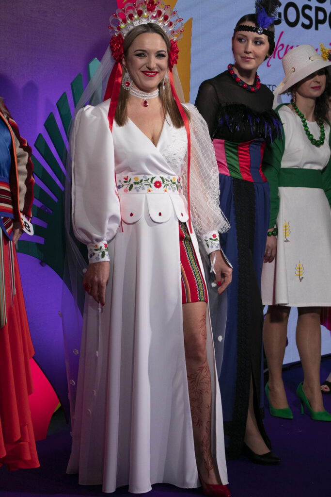 – Nasza propozycja to suknia ślubna inspirowana ludowymi strojami z powiatu piotrkowskiego, która została wykonana samodzielnie przez członkinie KGW Wolbórz. Nasza kopertowa suknia jest ozdobiona bufiastymi rękawami, z których jeden wykonany jest techniką koronki klockowej przez twórczynię ludową, panią Elżbietę Bąk. Głębokie rozcięcie kryje spódnicę z tradycyjnej zapaski, w których występują nasze dziewczyny z KGW – mówi Magdalena Wnukiewicz, reprezentująca KGW z Wolborza. Stój dopełniał efektowny czepiec z czerwonymi, wstążkowymi kwiatami, a także kamieniami, kryształkami i piórami oraz z tradycyjnym, tiulowym welonem ozdobiony kwiatuszkami wykonanymi metodą szydełkową.