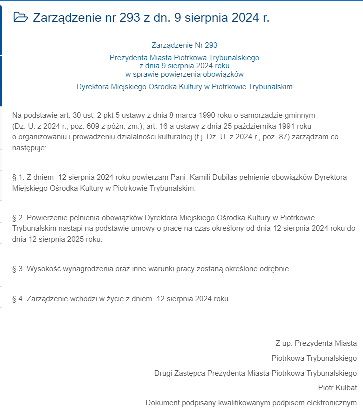 Kamila Dubilas zastąpiła na tym stanowisku Elżbietę Jarszak, której trzyletnia kadencja dyrektora MOK-u zakończyła się 11 sierpnia 2024 roku. Elżbieta Jarszak nie żegna się jednak z MOK-iem, a wraca na swoje poprzednie stanowisko – redaktor naczelnej Telewizji Piotrków. Kamila Dubilas obowiązki dyrektora pełnić będzie przez rok.