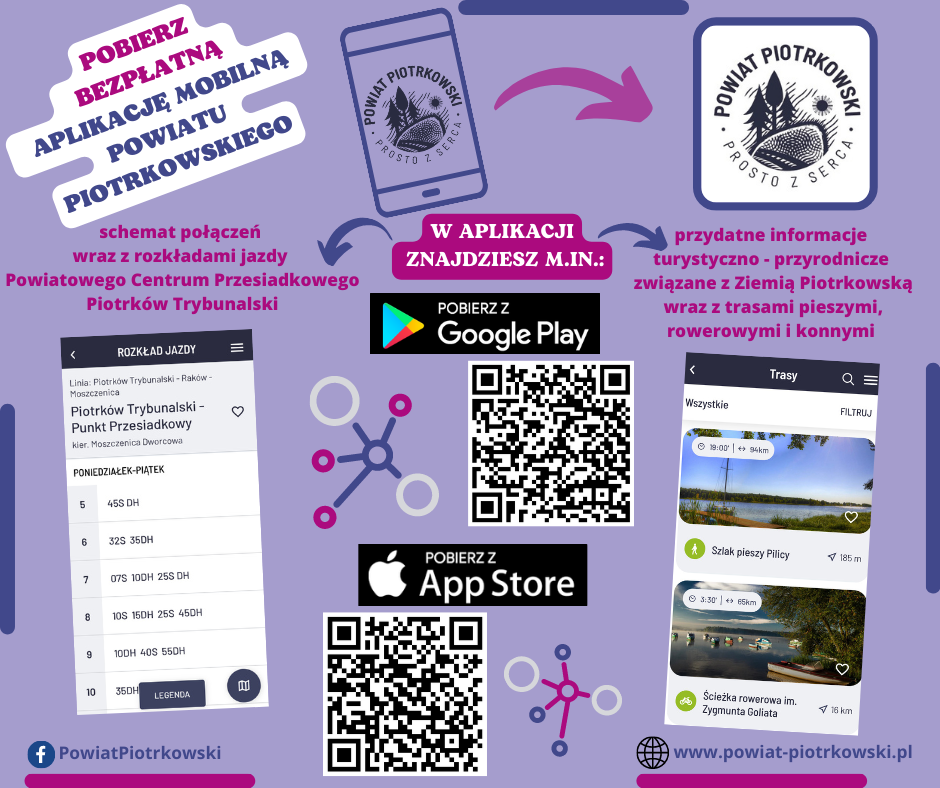 Wystarczy zeskanować kod QR i bezpłatna aplikacja powiatu piotrkowskiego będzie gotowa do użytku. Może ją pobrać każdy kto posiada telefon komórkowy, czy tablet z systemem Android lub iOS. W aplikacji znajduje się m.in. schemat połączeń wraz z rozkładami jazdy Powiatowego Centrum Przesiadkowego Piotrków Trybunalski, a także przydatne informacje turystyczno – przyrodnicze związane z ziemią piotrkowską z trasami pieszymi, rowerowymi i konnymi.
