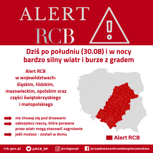 Uwaga! Dziś po południu (30.08) i w nocy bardzo silny wiatr i burze z gradem. Zabezpiecz rzeczy, które może porwać wiatr. Znajdź bezpieczne schronienie.”