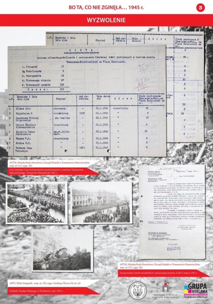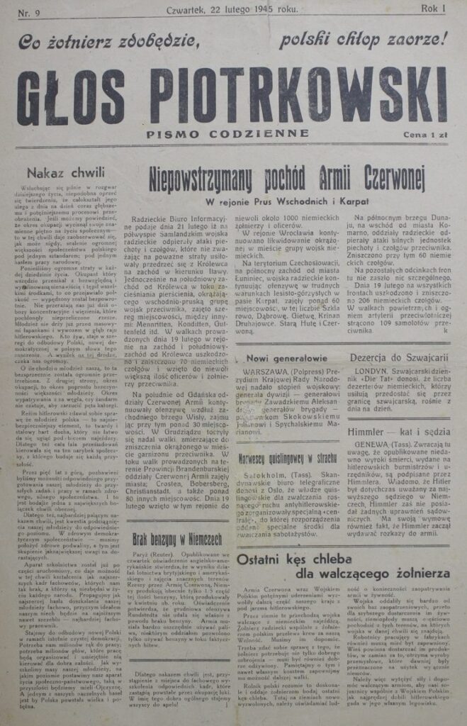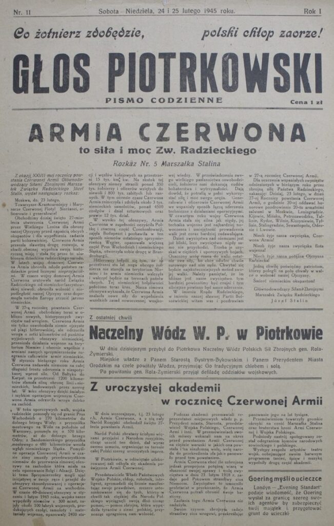 Przykłady ówczesnej piotrkowskiej prasy oraz zdjęć z początku 1945 r. pozwalają wczuć się w klimat tamtych dni. O walkach i ich ofiarach przypomina m.in. wykaz żołnierzy Armii Czerwonej, pochowanych wówczas na Placu Kościuszki w Tomaszowie Mazowieckim. Piotrkowski wątek swej kariery miał też Wojciech Jaruzelski, który w lipcu 1946 r. został mianowany wojskowym komendantem miasta.