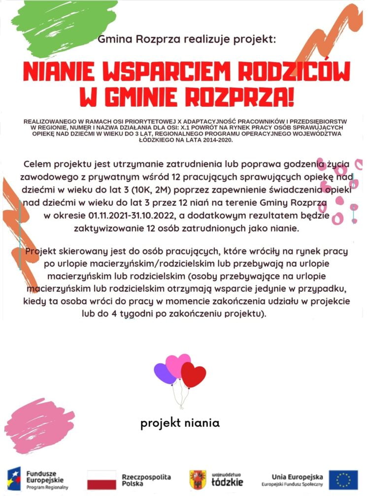 Wójt Gminy Rozprza Janusz Jędrzejczyk zaprasza osoby chętne do udziału w projekcie „Nianie wsparciem rodziców w Gminie Rozprza!”