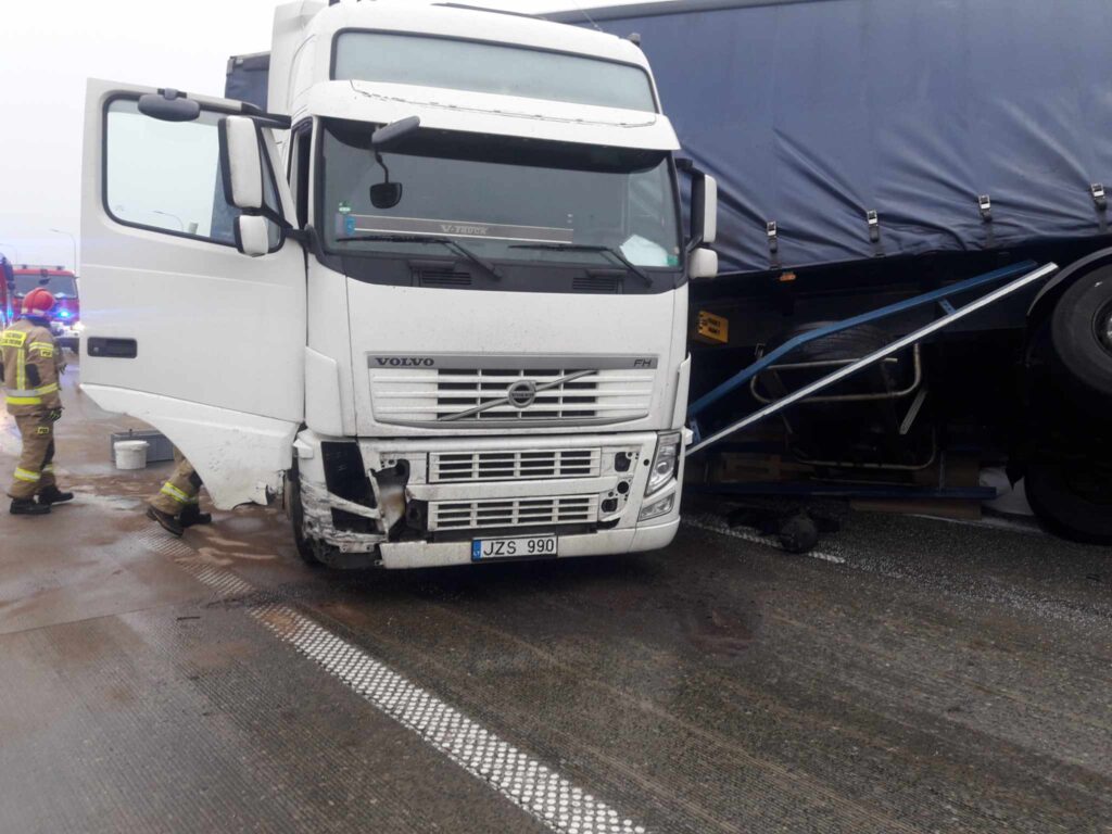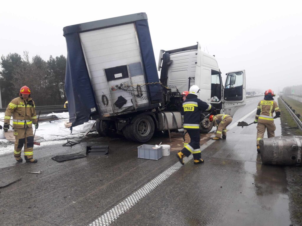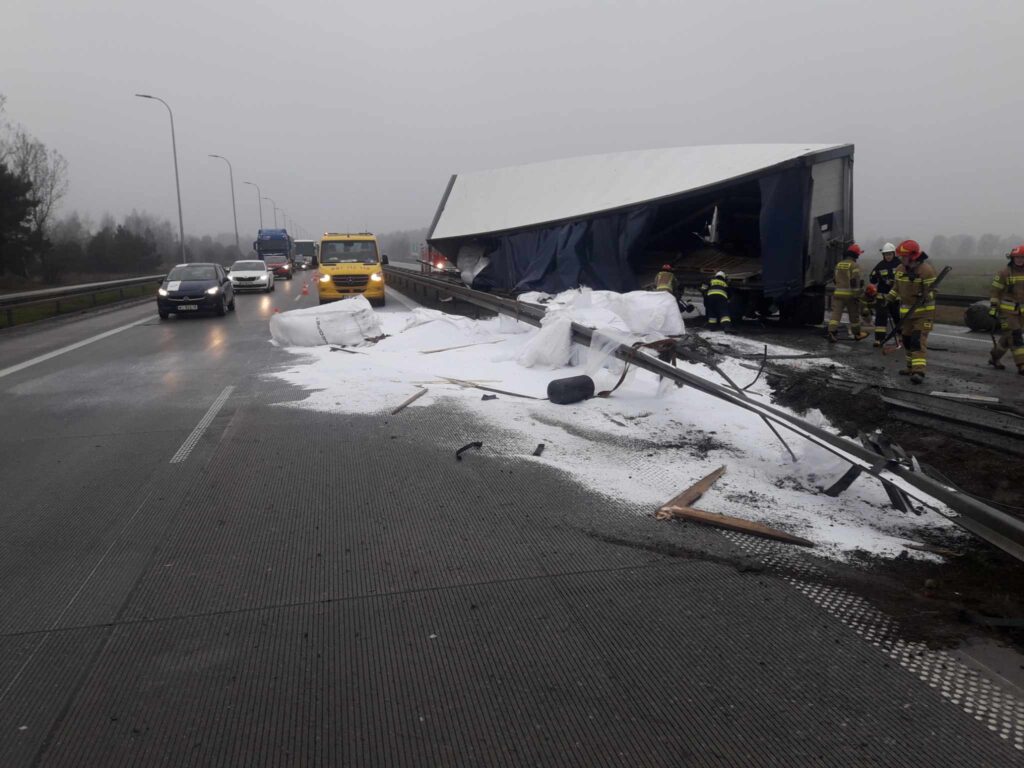 Do zdarzenia doszło w okolicy miejscowości Wiaderno, tuż za granicą powiatów piotrkowskiego i tomaszowskiego. Z naszych nieoficjalnych informacji wynika, że litewski kierowca prawdopodobnie stracił panowanie nad pojazdem, doprowadził do nagłego skrętu pojazdu i doszło do częściowego wywrócenia naczepy. Ładunek w postaci granulatu wysypał się na jezdnie. Potrzebny będzie specjalistyczny sprzęt by podnieść przyczepę a także uprzątnąć zniszczone bariery energochłonne.