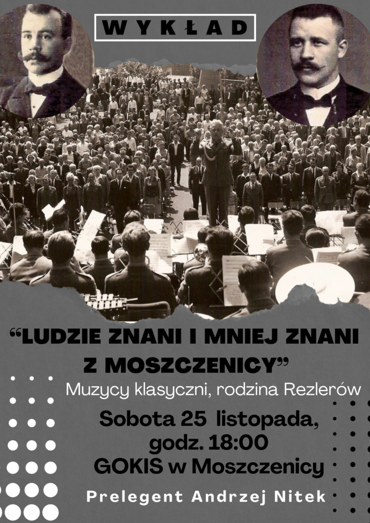Gminny Ośrodek Kultury i Sportu im Jana Justyny w Moszczenicy zaprasza na wykład historyczny pt. „Ludzie znani i mniej znani z Moszczenicy – Muzycy klasyczni, rodzina Rezlerów”. Wykład odbędzie się w sali widowiskowej GOKiS 25 listopada o godz. 18:00. Prelegentem będzie mieszkaniec gminy Moszczenica, regionalista – Andrzej Nitek.