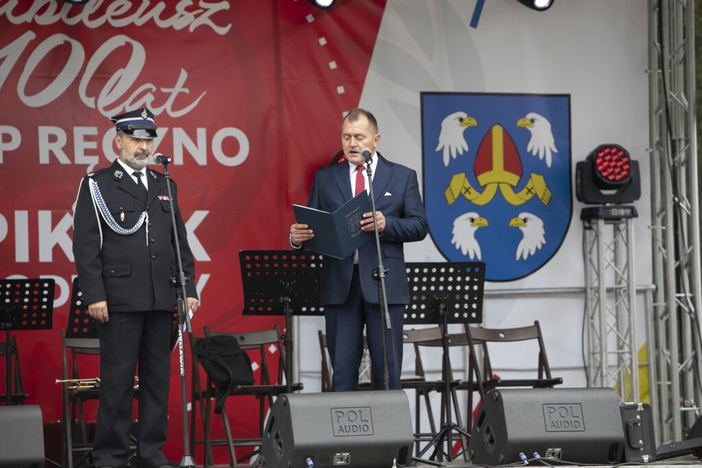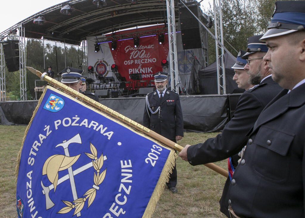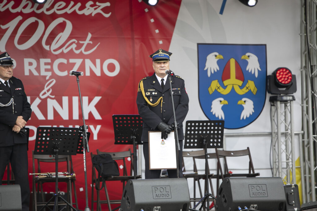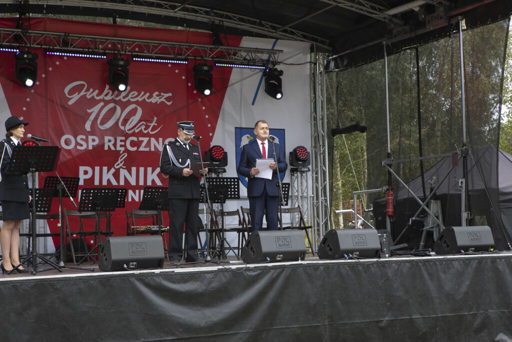 Uroczystość która odbywała się na stadionie lekkoatletycznym, rozpoczęła druhna Lidia Chmielewska. Przybyłych gości witali wójt Piotr Łysoń oraz prezes OSP Ręczno Dariusz Lorenc. Podczas uroczystości wręczono zostały złote, srebrne i brązowe medale „Za zasługi dla pożarnictwa” oraz medale na wysługę lat. Obchody 100-lecia były również okazją do odznaczenia sztandaru jednostki ,,Złotym Znakiem Związku”. W tym dniu, przekazano także jednostce OSP Ręczno średni wóz bojowy RENAULT, na zakup którego urząd gminy przekazał 650 tysięcy złotych.