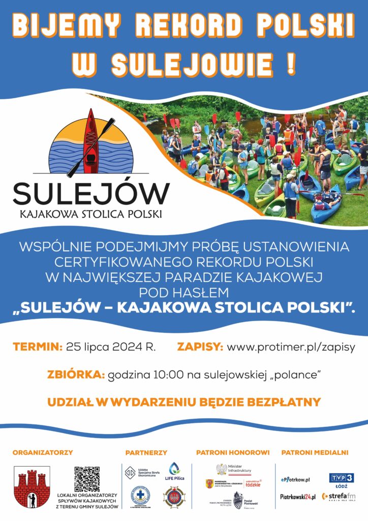 Lubicie pływać kajakami? Lubicie bić rekordy? Lubicie obcować z naturą? Jeśli tak, mamy dla Was wyjątkową propozycję. W czwartek, 25 lipca 2024 roku podejmiemy próbę ustanowienia rekordu Polski w największej paradzie kajakowej pod hasłem „Sulejów – kajakowa stolica Polski”. Udział w tym niecodziennym wydarzeniu będzie bezpłatny. W imieniu Doroty Jankowskiej, burmistrza Sulejowa zachęcamy do zapisów.
