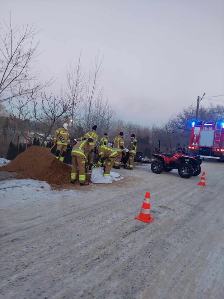 Strażacy ułożyli worki z piaskiem by zabezpieczyć przed zalaniem posesje na ulicy Błonie w Sulejowie. To skutki zamarznięcia rzeki i co za tym idzie, wezbrania jej stanu.