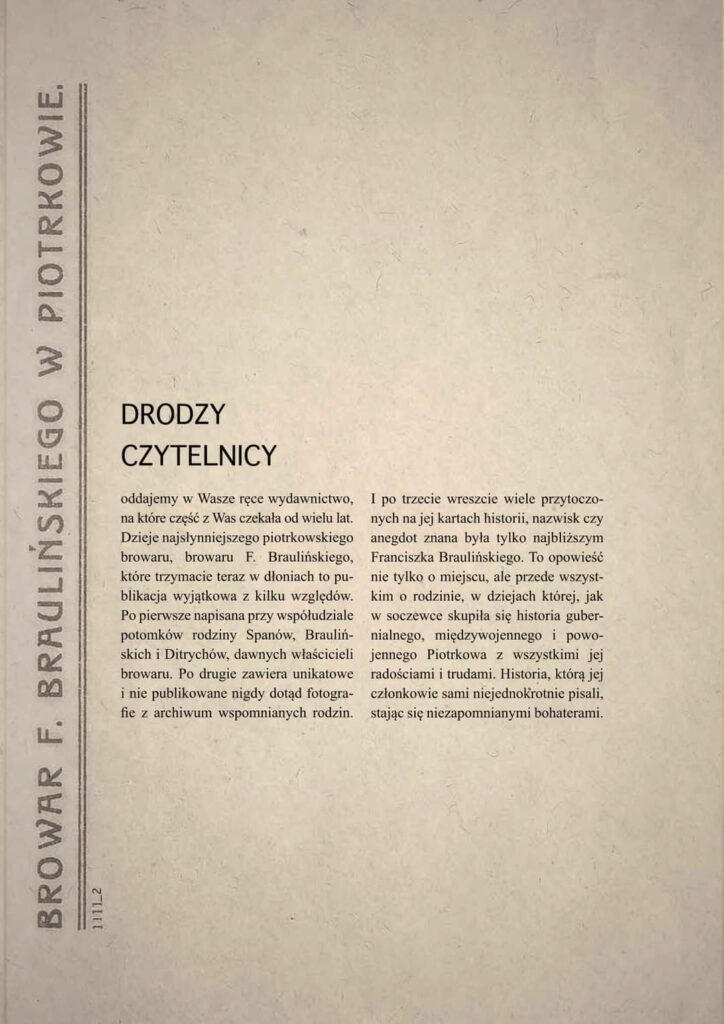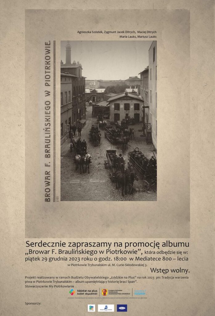 W imieniu stowarzyszenia „My Piotrkowianie” zapraszamy wszystkich miłośników dobrej lektury, którzy kochają odkrywać nowe nieznane piotrkowskie historie, na spotkanie promujące album pn.: „Browar F. Braulińskiego w Piotrkowie”. Autorką publikacji jest Agnieszka Szóstek, która na swoim koncie ma już kilka książek związanych z Piotrkowem. Spotkanie odbędzie się w najbliższy piątek (29.12) o godzinie 18:00 w Mediatece 800-lecia. Projekt realizowany jest w ramach Budżetu Obywatelskiego „Łódzkie na plus” na rok 2023.