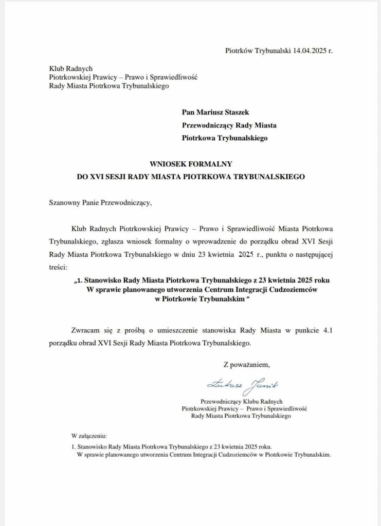 Wniosek o wprowadzenie takiego punktu złożył radny Łukasz Janik. W dokumencie, który rada miałaby przyjąć, czytamy między innymi: – Rada Miasta Piotrkowa Trybunalskiego wyraża sprzeciw wobec planów przyjmowania w ramach relokacji w Polsce, w tym w Piotrkowie Trybunalskim, obcych kulturowo migrantów z Afryki i Bliskiego Wschodu. Pragniemy wyrazić nasze stanowisko sprzeciwiające się utworzeniu Centrum Integracji Cudzoziemców w naszym mieście. Nasza decyzja opiera się na głębokim przekonaniu, że bezpieczeństwo mieszkańców Piotrkowa jest priorytetem, a wprowadzenie takiego centrum może stwarzać poważne zagrożenia. (…) Wierzymy, że nasze miasto powinno pozostać miejscem bezpiecznym i przyjaznym dla wszystkich jego mieszkańców, wzywamy prezydenta miasta Pana Juliusza Wiernickiego do podjęcia natychmiastowych działań zmierzających do powstrzymania utworzenia ośrodka dla migrantów. – pisze Janik.